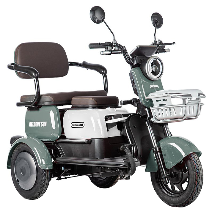 Трицикл Rutrike Gelbert Sun предназначен для комфортного передвижения по городским улицам в сухую погоду, а также перевозки пассажиров и бытовых грузов. Модель оснащена барабанными передним и задним тормозами, задним приводом, корзиной на руле, багажником, мягкими сиденьями и спинками, подлокотниками, откидным сиденьем и ручками для ребенка. Широкие колеса гарантируют комфортную езду. Аккумуляторные батареи и зарядное устройство в комплект поставки не входят. Дополнительные характеристики:
