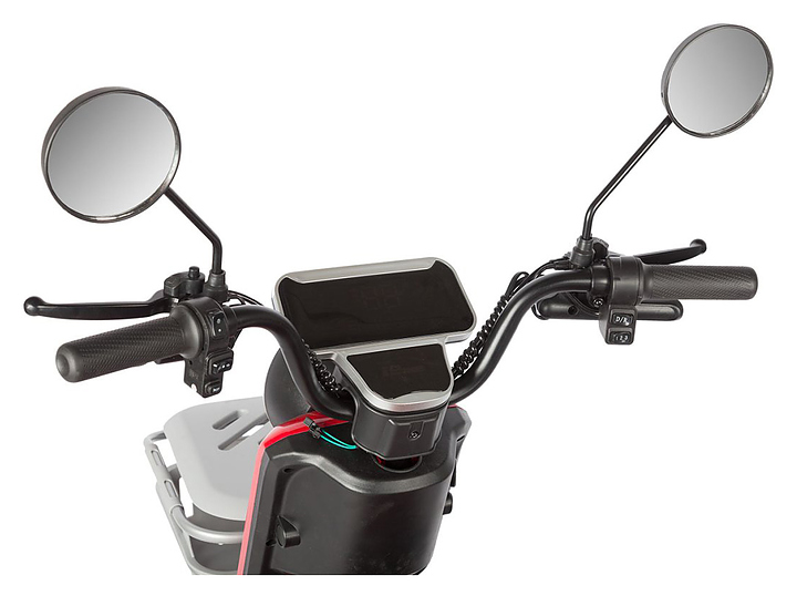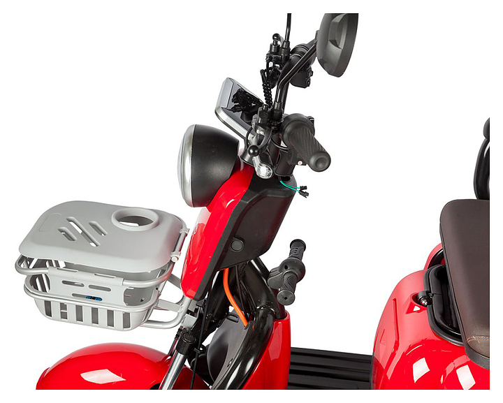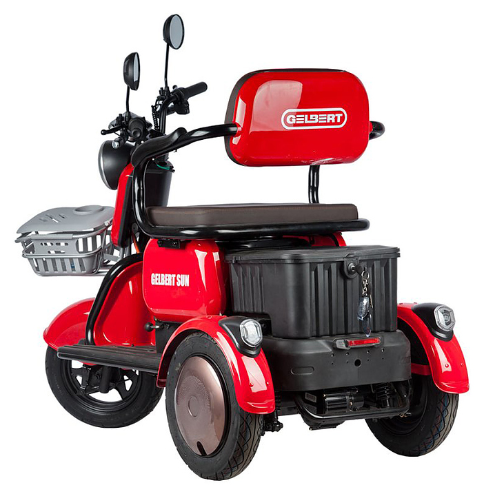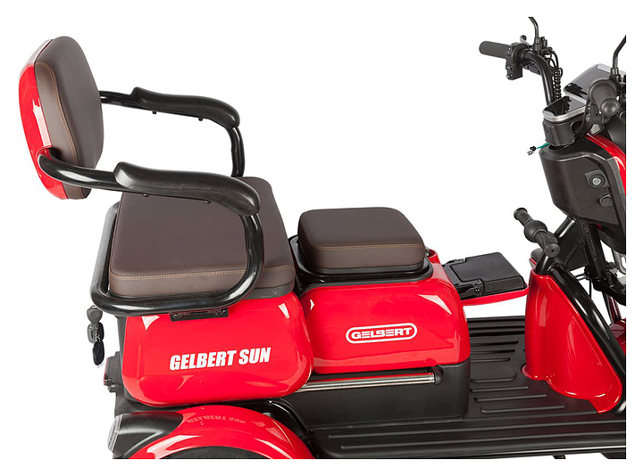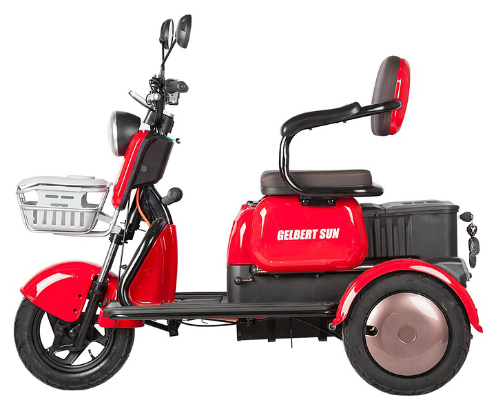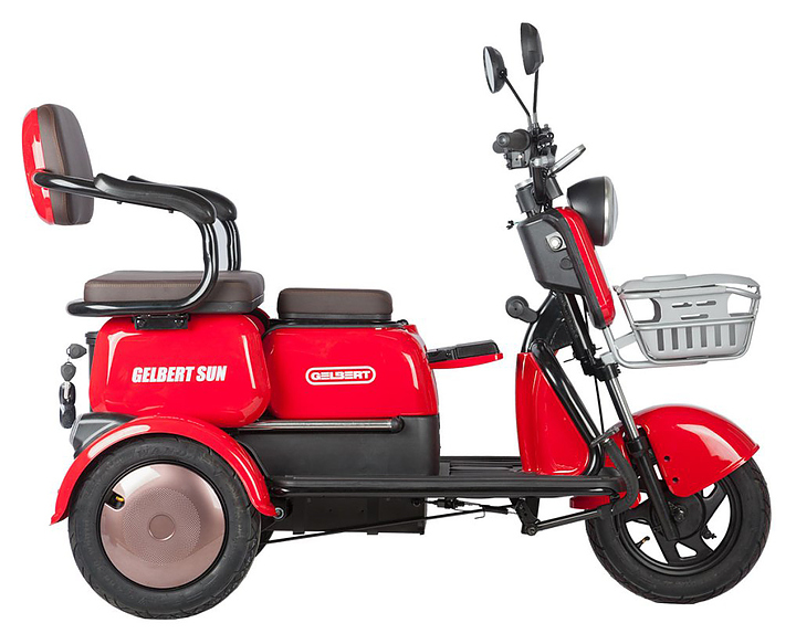 Трицикл Rutrike Gelbert Sun предназначен для комфортного передвижения по городским улицам в сухую погоду, а также перевозки пассажиров и бытовых грузов. Модель оснащена барабанными передним и задним тормозами, задним приводом, корзиной на руле, багажником, мягкими сиденьями и спинками, подлокотниками, откидным сиденьем и ручками для ребенка. Широкие колеса гарантируют комфортную езду. Аккумуляторные батареи и зарядное устройство в комплект поставки не входят. Дополнительные характеристики: