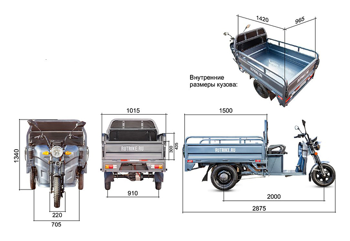 Грузовой электроцикл Rutrike Мастер 1500 используется для перемещения грузов и оборудования в курортных зонах, парках, в складских помещениях, на территории промышленных предприятий, заводов и фабрик. Модель оснащена грузовым отсеком с высокими бортами, яркой светодиодной фарой и цифровой приборной панелью. Покрышки имеют развитые грунтозацепы для передвижения по твердому и мягкому дорожному покрытию. Пониженная передача с усиленным редуктором позволяет уверенно преодолевать подъемы и неровные поверхности. Внимание! Данная конструкция не предусмотрена для фиксации кузова в поднятом положении, а лишь для облегчения его подъёма! Аккумуляторные батареи и зарядное устройство в комплект поставки не входят. Особенности: