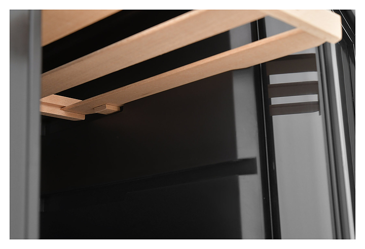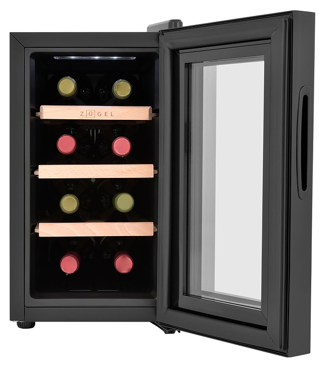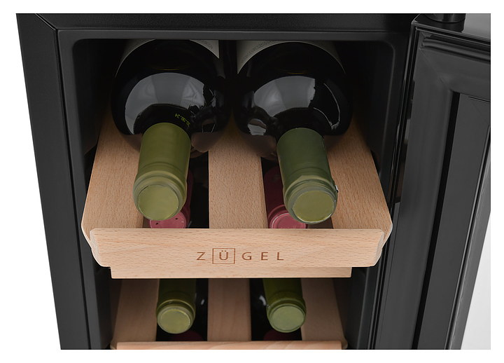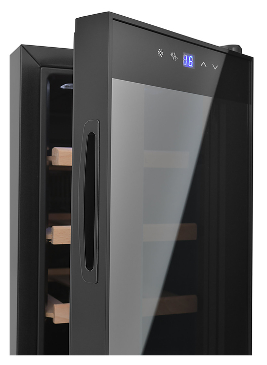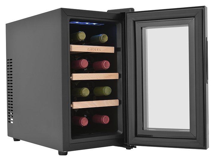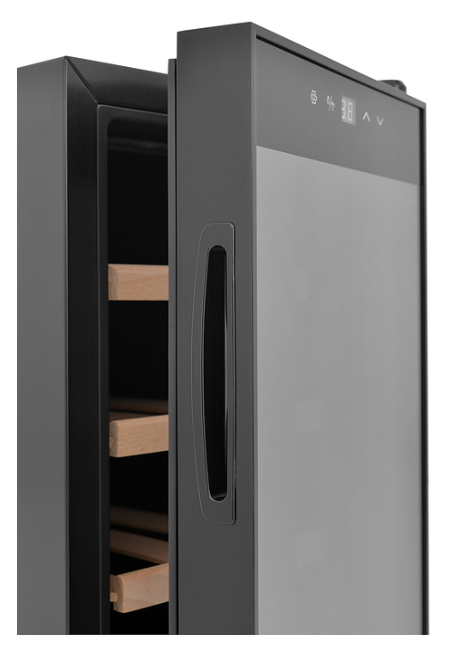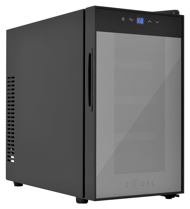 Винный шкаф Zugel ZTWF82B предназначен для хранения при оптимальных условиях бутилированного вина различных сортов в барах, ресторанах, специализированных магазинах, подсобных складских помещениях, а также домашних условиях. Модель оснащена монотемпературной холодильной камерой c интегрированными направляющими для полок, правосторонней распашной дверью с обзорным остеклением, кабелем питания, расположенной на фасаде двери электронной панелью управления с сенсорными функциональными клавишами и цифровым жидкокристаллическим дисплеем с голубой подсветкой индикации. Корпус выполнен из металла с матовым антикоррозийным покрытием черного цвета, рама двери и внутренняя облицовка камеры черного цвета, остекление – из тонированного закаленного стекла, полки – из массива буковой древесины с фронтальной гравировкой логатипа. В комплект поставки входят 3 съемные полки с направляющими для размещения бутылок, инструкция по эксплуатации, гарантийный талон и заводская упаковка. Особенности: