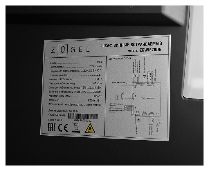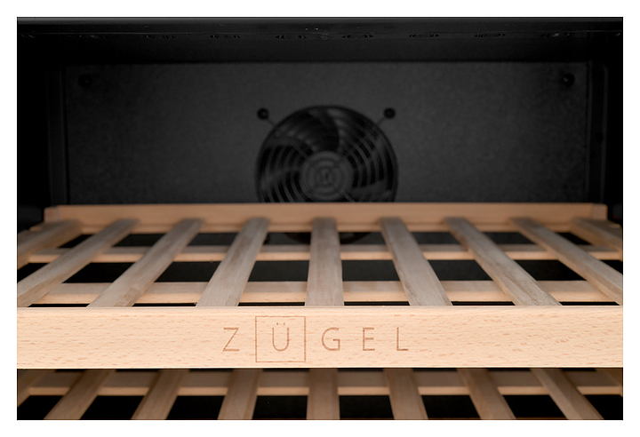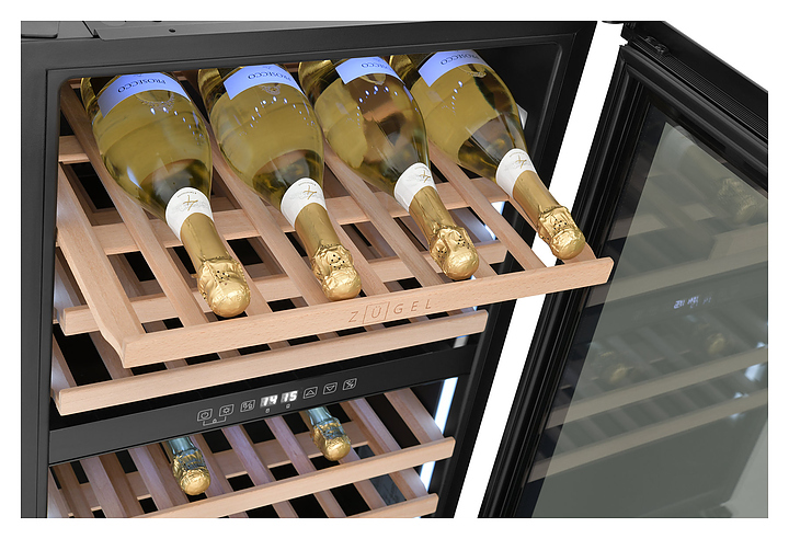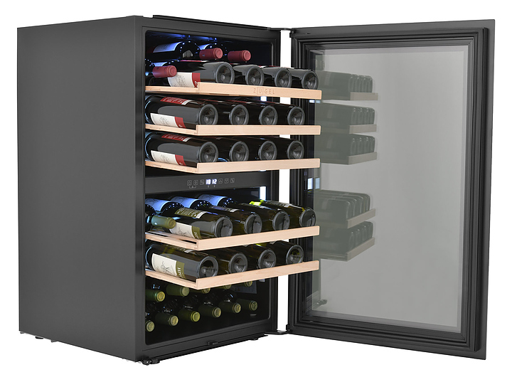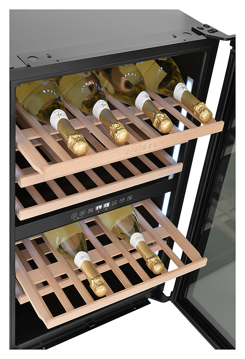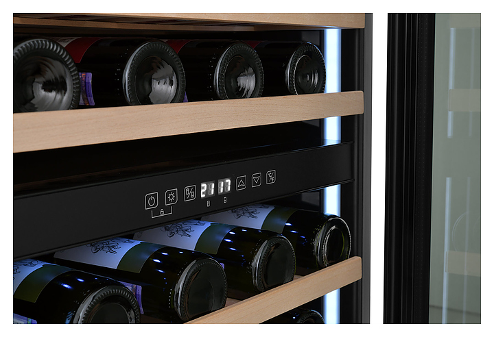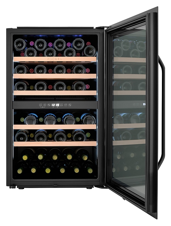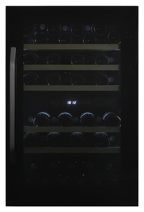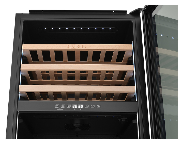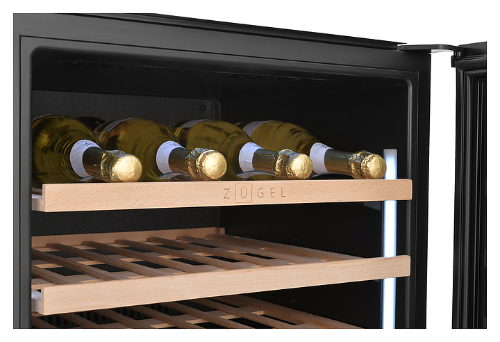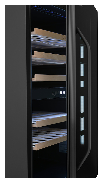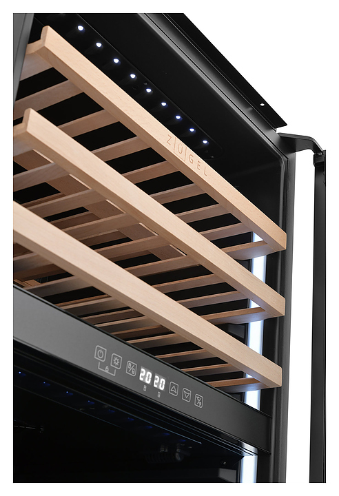 Винный шкаф Zugel ZCWI570DB предназначен для хранения при оптимальных условиях бутилированного вина различных сортов в барах, ресторанах, специализированных магазинах, подсобных складских помещениях, а также домашних условиях. Модель оснащена холодильной камерой c 2 температурными зонами, интегрированными направляющими для полок, правосторонней распашной дверью на перенавешиваемых петлях с длинной уплощенной вертикальной рукояткой и обзорным остеклением, кабелем питания, расположенной внутри камеры электронной панелью управления с сенсорными функциональными клавишами и 2 цифровыми светодиодными дисплеями с белой подсветкой индикации. Корпус выполнен из металла с антикоррозийным покрытием, дверь с полным фронтальным остеклением без винтового крепежа, рама двери и внутренняя облицовка камеры черного цвета, рукоятка – из металла с матовым покрытием черного цвета, остекление – из закаленного стекла с дымчатой тонировкой, полки – из массива буковой древесины с фронтальной гравировкой логатипа. В комплект поставки входят 5 съемных полок с направляющими для размещения бутылок, набор крепежа, инструкция по эксплуатации, гарантийный талон и заводская упаковка. Особенности: