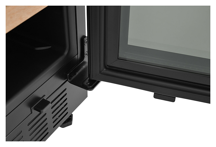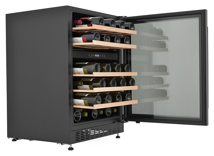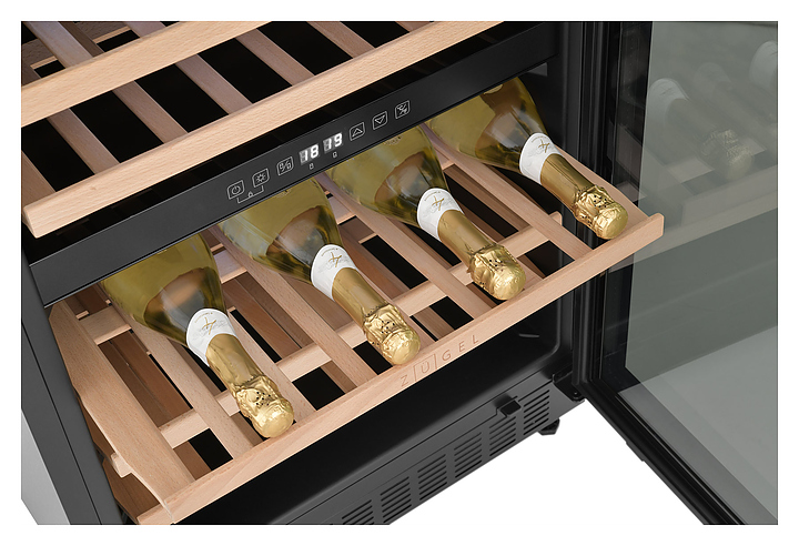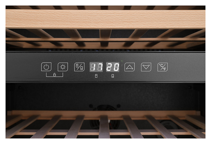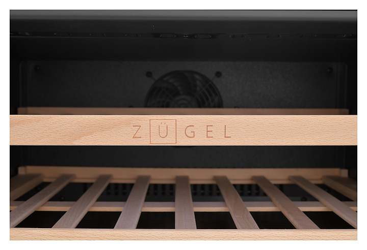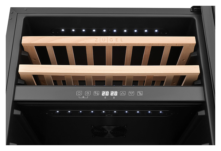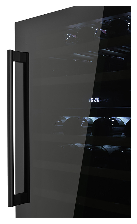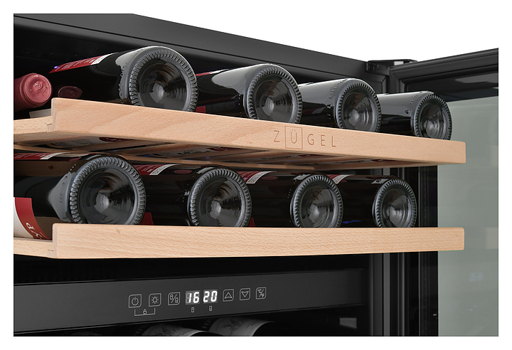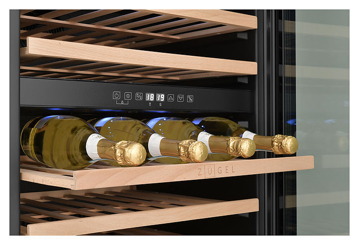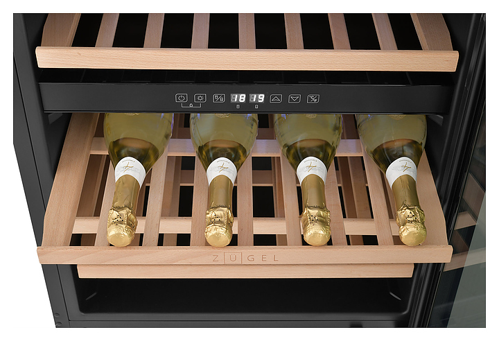 Винный шкаф Zugel ZCWI460DB предназначен для хранения при оптимальных условиях бутилированного вина различных сортов в барах, ресторанах, специализированных магазинах, подсобных складских помещениях, а также домашних условиях. Модель оснащена холодильной камерой c 2 температурными зонами, интегрированными направляющими для полок, правосторонней распашной дверью на перенавешиваемых петлях с длинной трубчатой вертикальной рукояткой и обзорным остеклением, цокольной вентиляционной решеткой, кабелем питания, расположенной внутри камеры электронной панелью управления с сенсорными функциональными клавишами и 2 цифровыми светодиодными дисплеями с белой подсветкой индикации. Корпус выполнен из металла с антикоррозийным покрытием, дверь с полным фронтальным остеклением без винтового крепежа, рама двери и внутренняя облицовка камеры черного цвета, рукоятка – из металла с матовым покрытием черного цвета, остекление – из закаленного стекла с дымчатой тонировкой, полки – из массива буковой древесины с фронтальной гравировкой логатипа. В комплект поставки входят 5 съемных полок с направляющими для размещения бутылок, набор крепежа, инструкция по эксплуатации, гарантийный талон и заводская упаковка. Особенности: