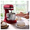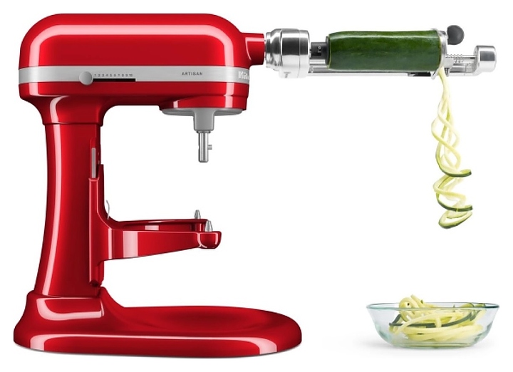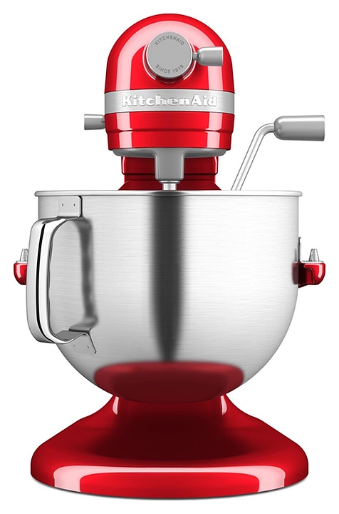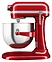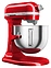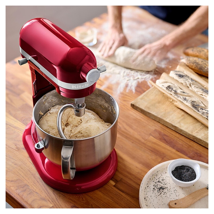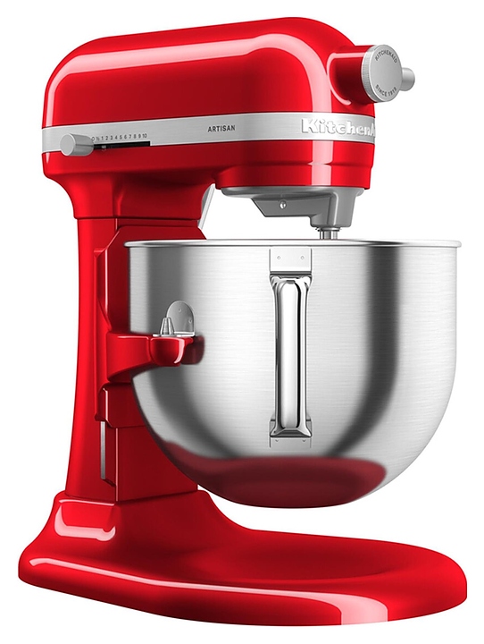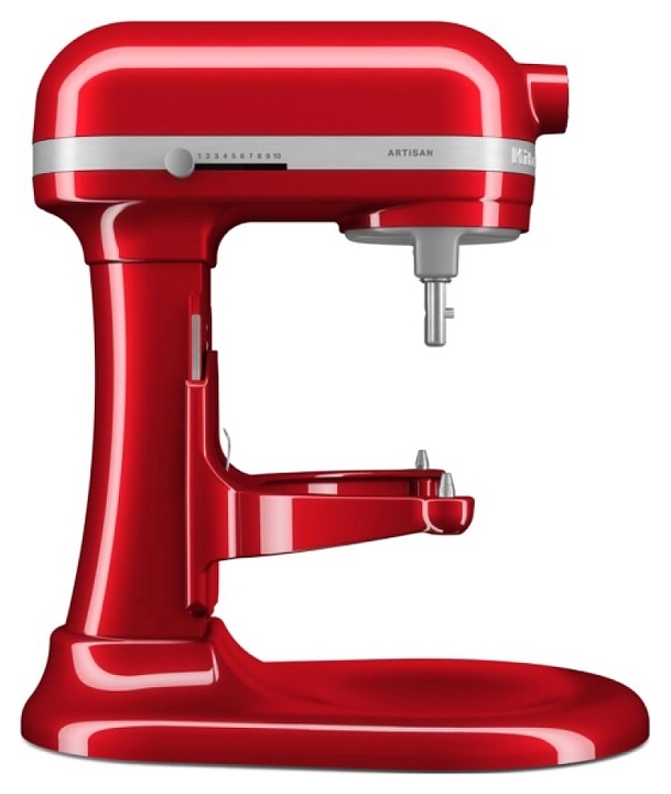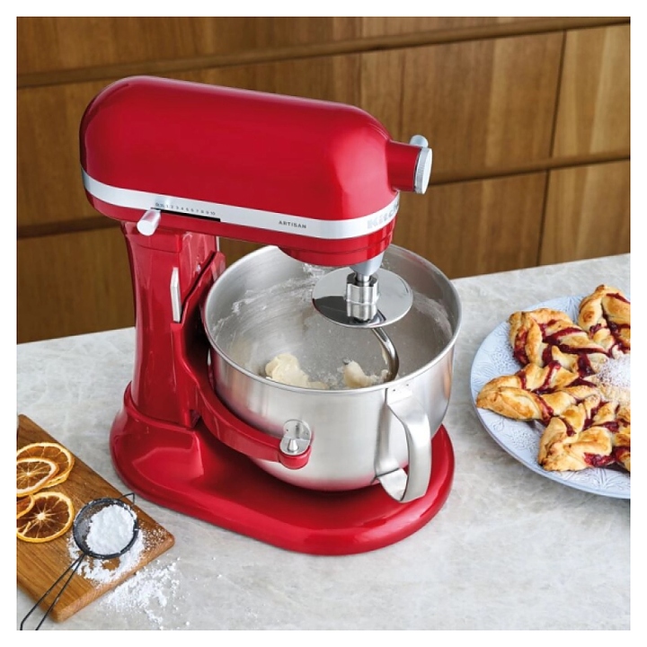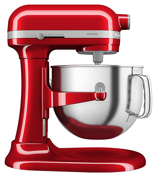 Настольный планетарный миксер KitchenAid Artisan 5KSM70SHXECA серии Heavy Duty используется в домашних условиях для замеса теста различной консистенции, в том числе белкового, заварного, дрожжевого, бисквитного, а также приготовления пюре, кремов, муссов и соусов. Механизм вращения месильного органа аналогичен поступательно-вращательному движению планет, причем насадка вращается вдоль своей оси в противоположном направлении поступательному движению, таким образом ингредиенты тщательно перемешиваются в однородную массу. Модель оснащена электродвигателем переменного тока, механизмом подъема и опускания чаши с фиксирующими лапками, кабелем питания с вилкой и электромеханической панелью управления. Литой корпус обтекаемой формы выполнен из цинка с покрытием износостойкой эмалью оттенка карамельное яблоко (Candy Apple) и декоративной серебристой полосой с логотипом по периметру нижней части головки моторного блока, рычаги управления – из металла с полимерными рукоятками, чаша – из нержавеющей стали с серебристой полированной поверхностью, венчик, крюк и лопатка – из нержавеющей стали, лопатка с гибким ребром – из металла с антибактериальным полиэфирным покрытием с содержанием серебра, защитный обод – из пластика. Комплектация: