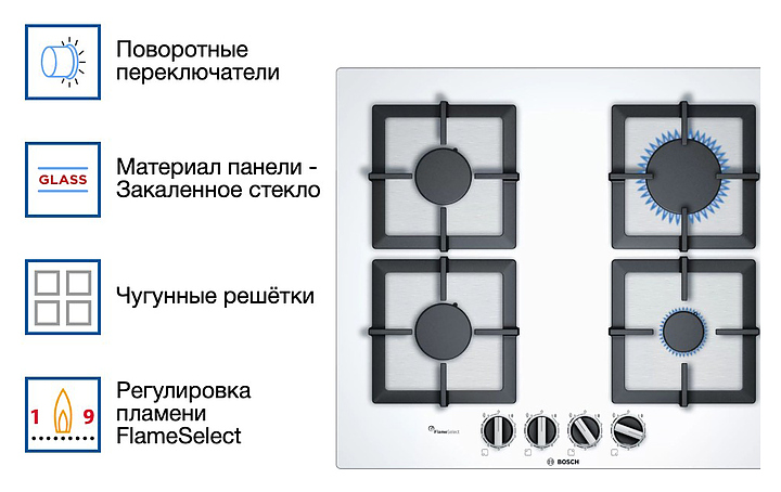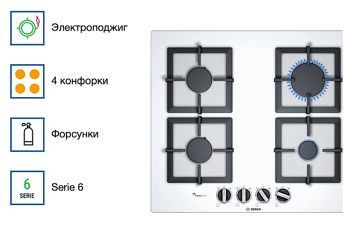 Газовая варочная панель Bosch PPP6A2B20O серии 6 предназначена для приготовления большого ассортимента блюд в наплитной посуде в домашних условиях. Модель оснащена 4 конфорками различной мощности и поворотными переключателями. Функция FlameSelect обеспечивает точную регулировку пламени на 9 различных ступенях мощности. Термоэлектрическая защита от утечки газа и автоматический электроподжиг гарантируют комфортную и безопасную эксплуатацию. Рабочая поверхность выполнена из закаленного стекла, индивидуальные решетки - из чугуна. В комплект поставки входят форсунки (жиклеры) для баллонного газа и Особенности: