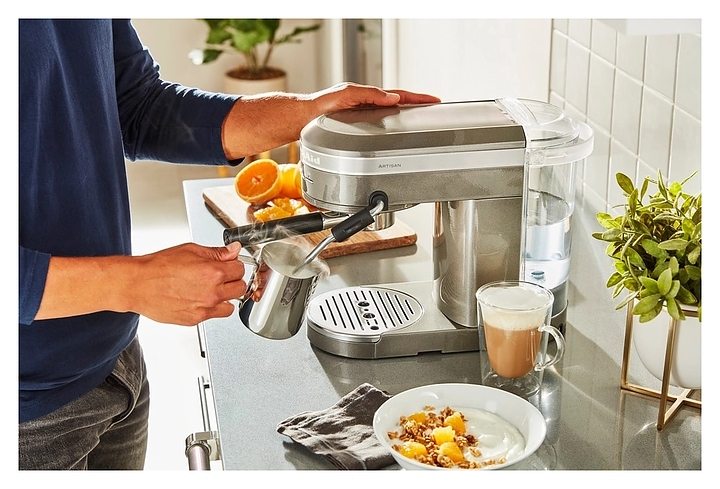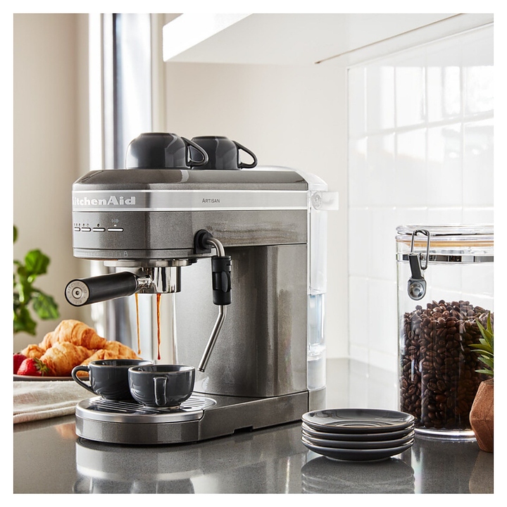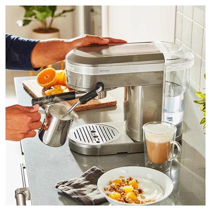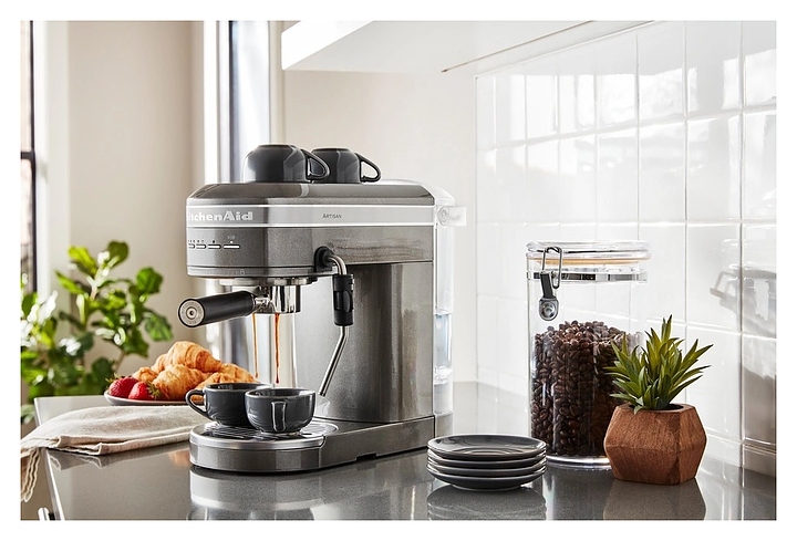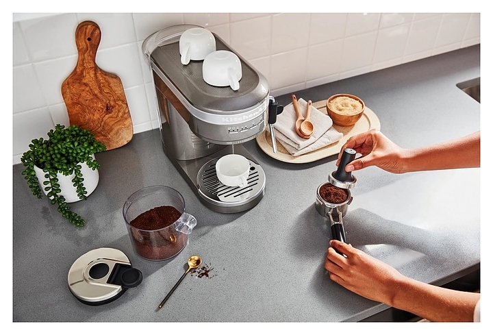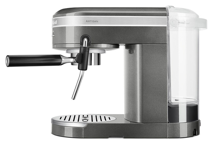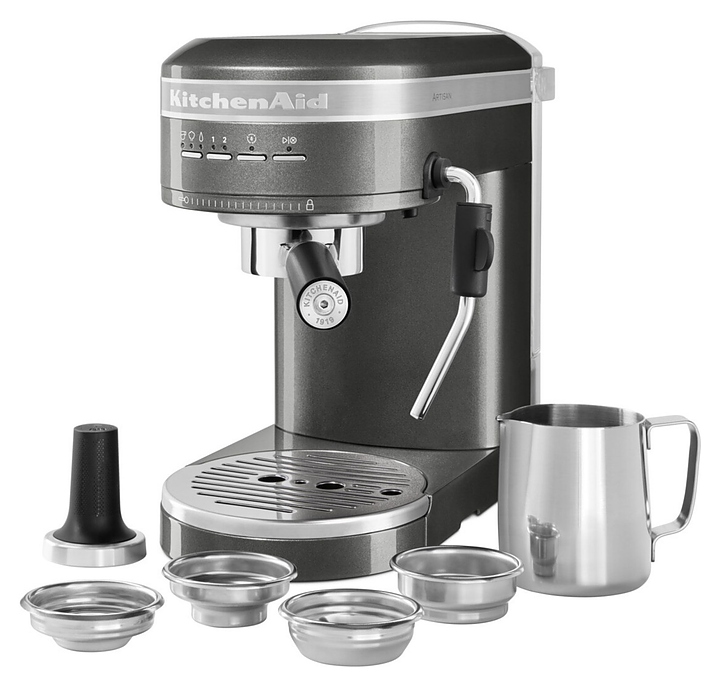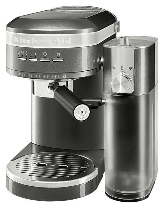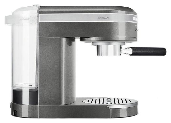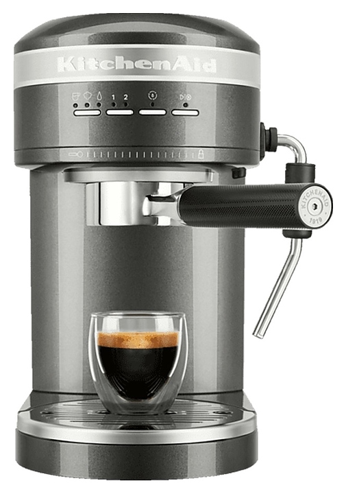 Рожковая кофеварка KitchenAid Artisan 5KES6503EMS используется для приготовления кофе эспрессо и напитков на его основе в домашних условиях. Модель оснащена эффективным насосом (Италия), кабелем питания с вилкой, расположенной на фронтальной стенке панелью управления с нажимными функциональными клавишами и светодиодными сигнальными индикаторами. Корпус выполнен из металла и пластика с покрытием оттенка серебряный медальон (Medallion Silver) и декоративной серебристой полосой с логотипом по периметру верхней части, паровая трубка, корпус холдера, головка темпера и решетка каплесборника – из высококачественной нержавеющей стали, питчер – из металла с полированной серебристой поверхностью, рукоятки холдера и темпера – из черного АБС-пластика. Комплектация: