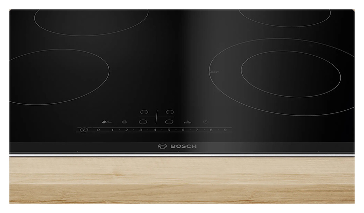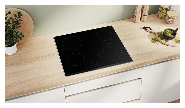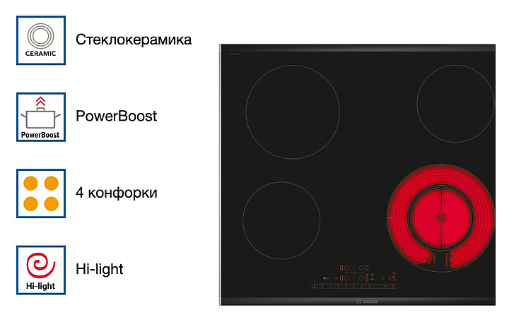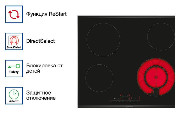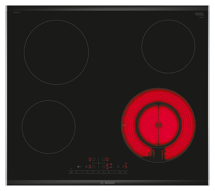 Электрическая варочная панель Bosch PKF675FP2E серии 6 предназначена для приготовления большого ассортимента блюд в наплитной посуде в домашних условиях. Модель оснащена 4 конфорками различной мощности, сенсорной панелью управления DirectSelect, LCD-дисплеем, таймером и двухконтурно конфоркой. Функция ReStart сохраняет все установленные настройки варочной панели при неожиданном отключении прибора из-за возникших проблем. Рабочая поверхность выполнена из стеклокерамики, профиль по бокам - из металла. В комплект поставки входит сетевой кабель без вилки. Особенности: