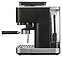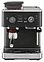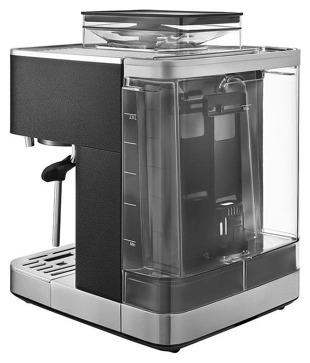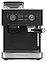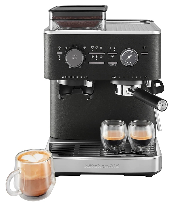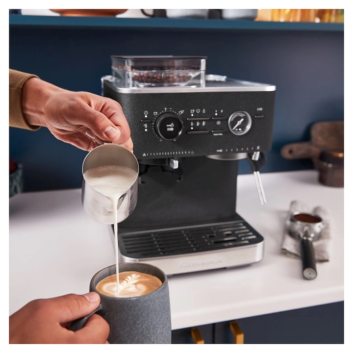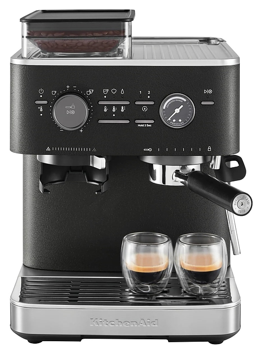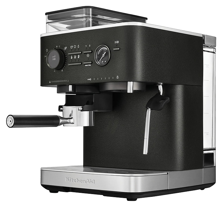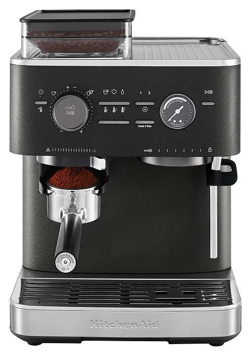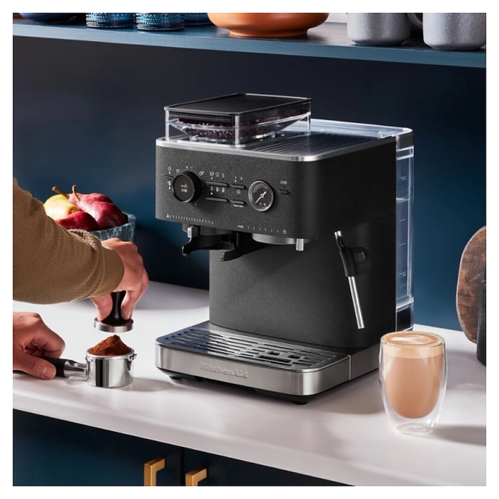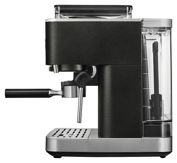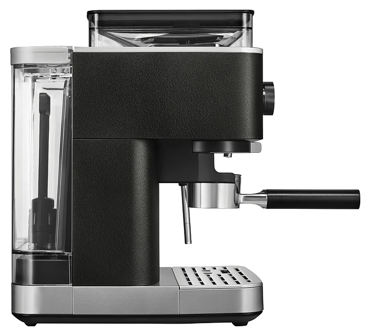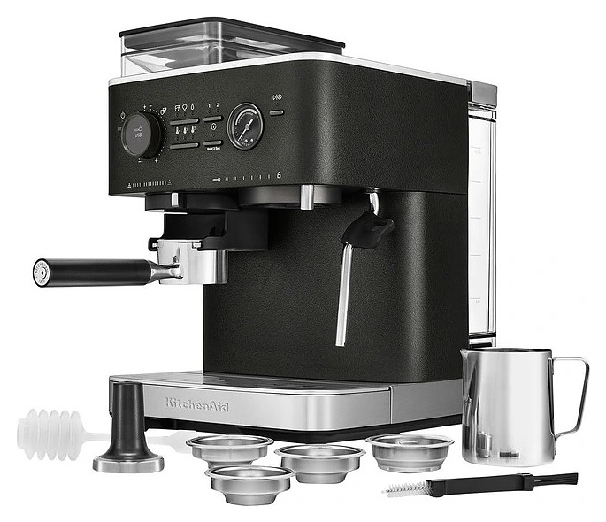 Полуавтоматическая эспрессо кофемашина KitchenAid 5KES6551EBK предназначена для приготовления кофе эспрессо и напитков на его основе в домашних условиях. Модель оснащена 2 трубками: для подачи пара с регулируемым углом поворота и стационарной для подачи горячей воды, кабелем питания с вилкой и расположенной на фронтальной стенке панелью управления с круглым поворотно-нажимным переключателем, нажимными функциональными клавишами и светодиодными сигнальными индикаторами. Корпус прямоугольно ориентированной формы выполнен из металла и пластика с поверхностью оттенка черный чугун (Cast Iron Black Edition) с серебристой окантовкой основания с логатипом, жернова кофемолки – из закаленной стали, питчер – из металла с полированной серебристой поверхностью, трубки подачи горячей воды и пара, корпусы холдера и темпера – из нержавеющей стали, рукоятки холдера и темпера – из черного АБС-пластика с нескользящей текстурной поверхностью.
