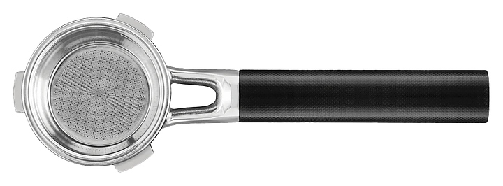 Профессиональный холдер (держатель портафильтра) с цилиндрической рукояткой, устойчивым плоским основанием, 2 заглубленными носиками и фиксирующими выступами на борте