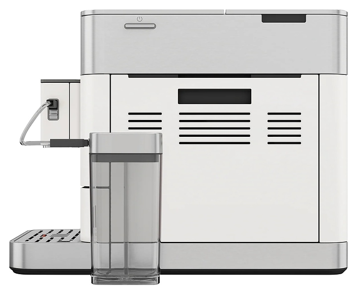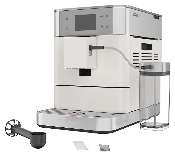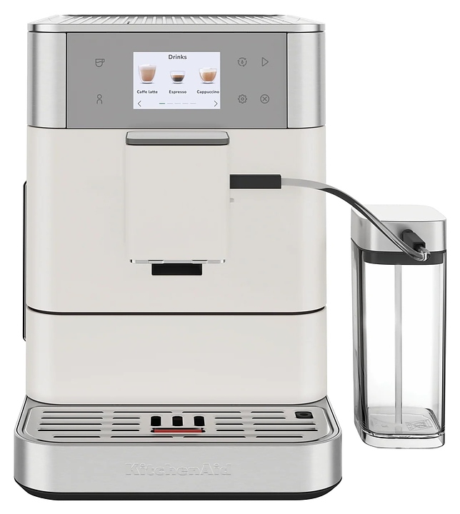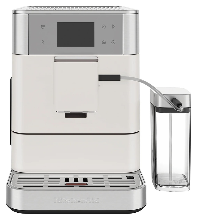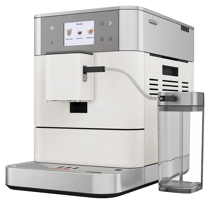 Автоматическая эспрессо кофемашина KitchenAid KF7 5KES8557EPL предназначена для приготовления кофе эспрессо и напитков на его основе в домашних условиях. Модель оснащена встроенными насосом и капучинатором, диспенсером с 2 соплами, кабелем питания с вилкой и расположенной на фронтальной стенке электронной панелью с сенсорными функциональными клавишами и информативным цветным сенсорным дисплеем управления и индикации. Корпус прямоугольно ориентированной формы выполнен из металла и АБС-пластика с поверхностью оттенка фарфорово-белый (Porcelain), окантовки по периметру верхей части и основания с серебристой поверхностью, жернова кофемолки – из закаленной стали.