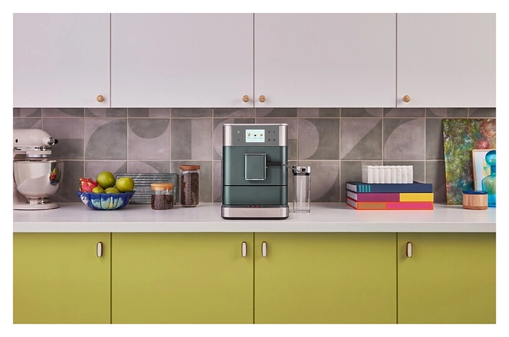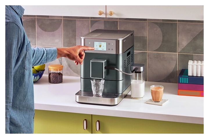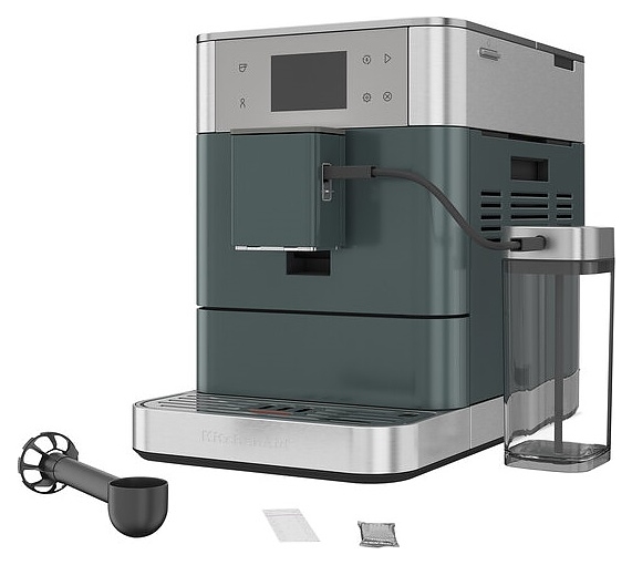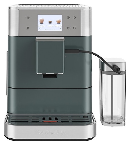 Автоматическая эспрессо кофемашина KitchenAid KF7 5KES8557EJP предназначена для приготовления кофе эспрессо и напитков на его основе в домашних условиях. Модель оснащена встроенными насосом и капучинатором, диспенсером с 2 соплами, кабелем питания с вилкой и расположенной на фронтальной стенке электронной панелью с сенсорными функциональными клавишами и информативным цветным сенсорным дисплеем управления и индикации. Корпус прямоугольно ориентированной формы выполнен из металла и АБС-пластика с поверхностью оттенка можжевельник (Juniper), окантовки по периметру верхей части и основания с серебристой поверхностью, жернова кофемолки – из закаленной стали.