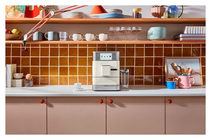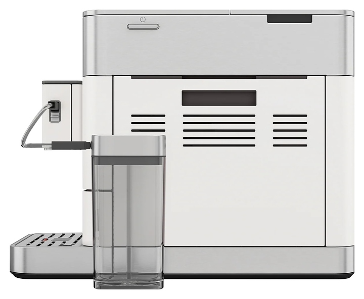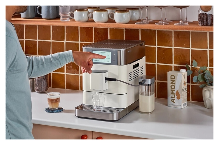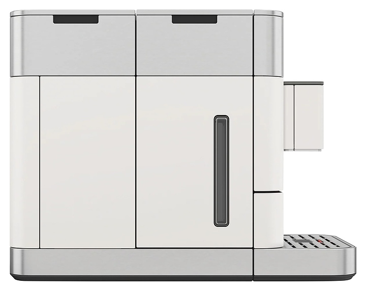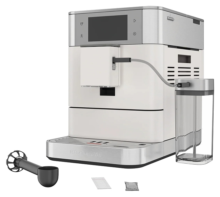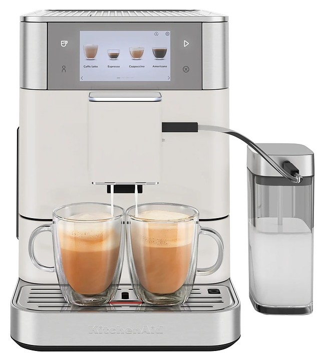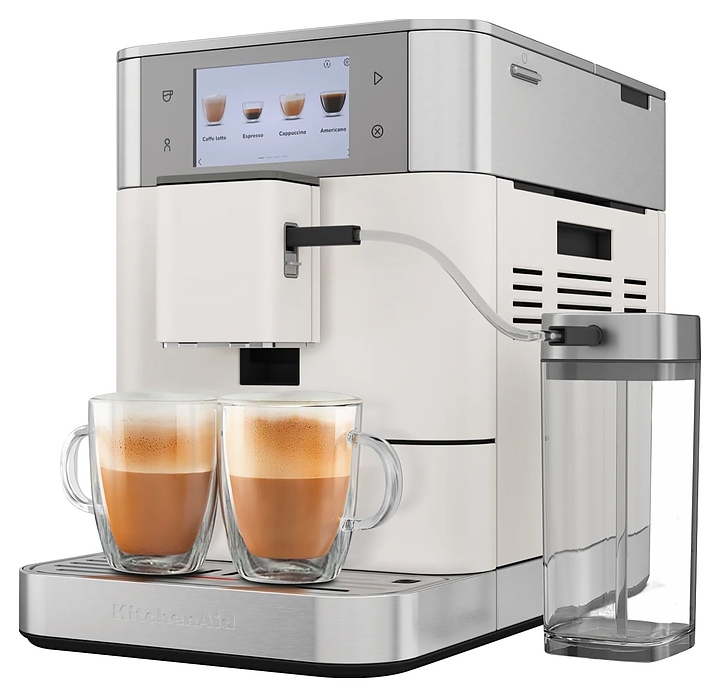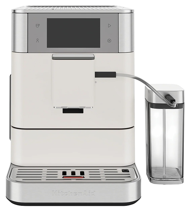 Автоматическая эспрессо кофемашина KitchenAid KF8 5KES8558EPL предназначена для приготовления кофе эспрессо и напитков на его основе в домашних условиях. Модель оснащена встроенными насосом и капучинатором, диспенсером с 2 соплами, кабелем питания с вилкой и расположенной на фронтальной стенке электронной панелью с сенсорными функциональными клавишами и информативным цветным сенсорным дисплеем управления и индикации. Корпус прямоугольно ориентированной формы выполнен из металла и АБС-пластика с поверхностью оттенка с поверхностью оттенка фарфоровый белый (Porcelain), окантовки по периметру верхей части и основания с серебристой поверхностью, жернова кофемолки – из закаленной стали.