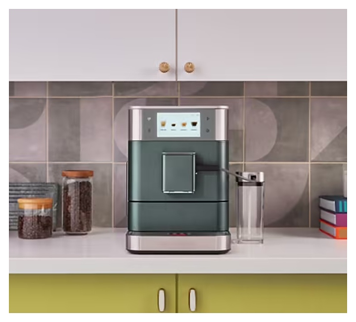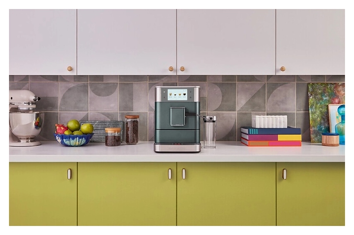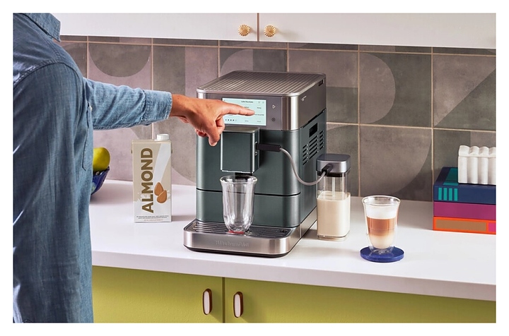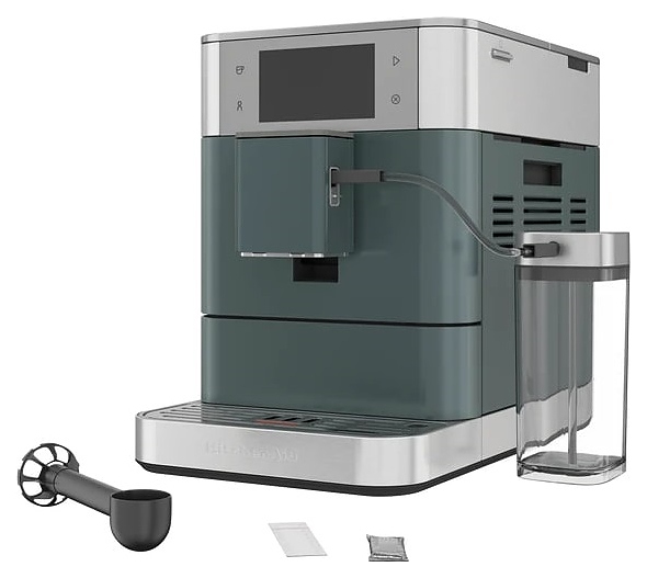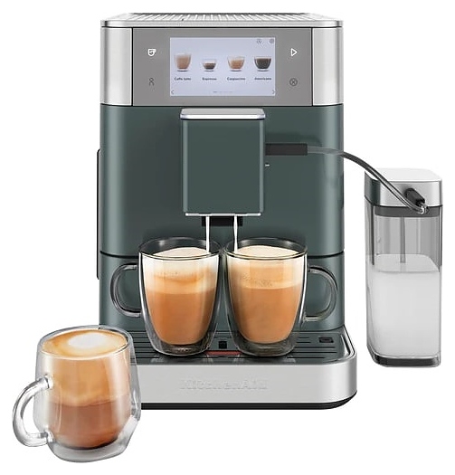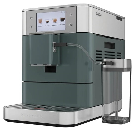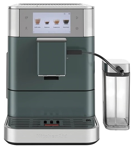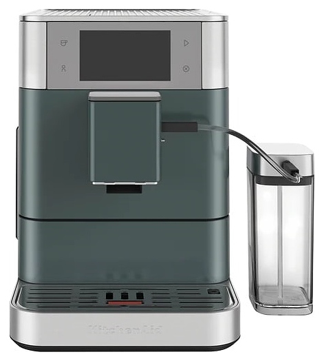Автоматическая эспрессо кофемашина KitchenAid KF8 5KES8558EJP предназначена для приготовления кофе эспрессо и напитков на его основе в домашних условиях. Модель оснащена встроенными насосом и капучинатором, диспенсером с 2 соплами, кабелем питания с вилкой и расположенной на фронтальной стенке электронной панелью с сенсорными функциональными клавишами и информативным цветным сенсорным дисплеем управления и индикации. Корпус прямоугольно ориентированной формы выполнен из металла и АБС-пластика с поверхностью оттенка можжевельник (Juniper), окантовки по периметру верхей части и основания с серебристой поверхностью, жернова кофемолки – из закаленной стали.
