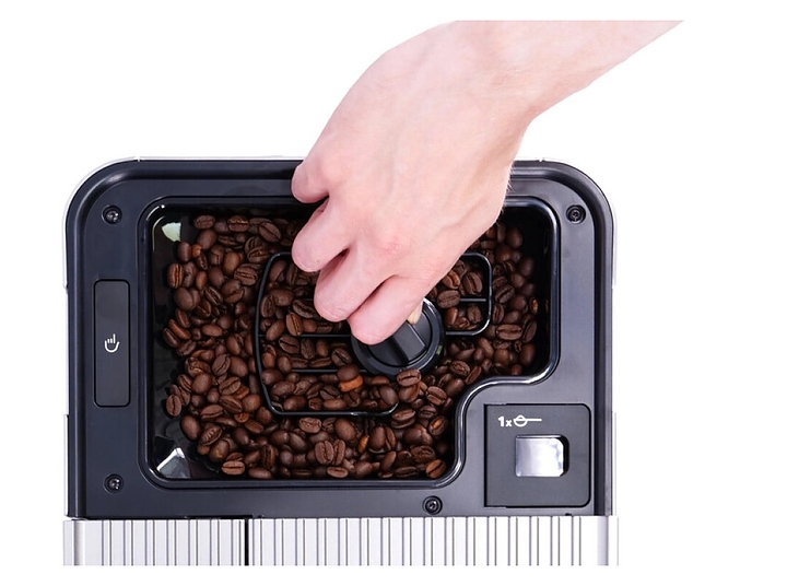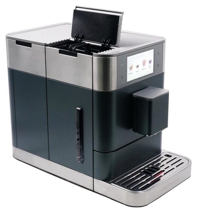Верхняя панель с рельефной поверхностью для возможности хранения и пассивного подогрева чашек, съемной крышкой над загрузочным отделением и фиксируемой в открытом положении откидной крышкой над резервуаром для воды