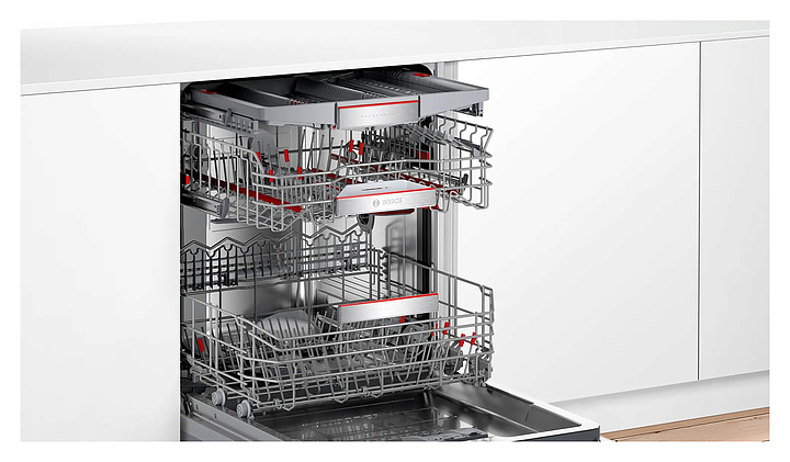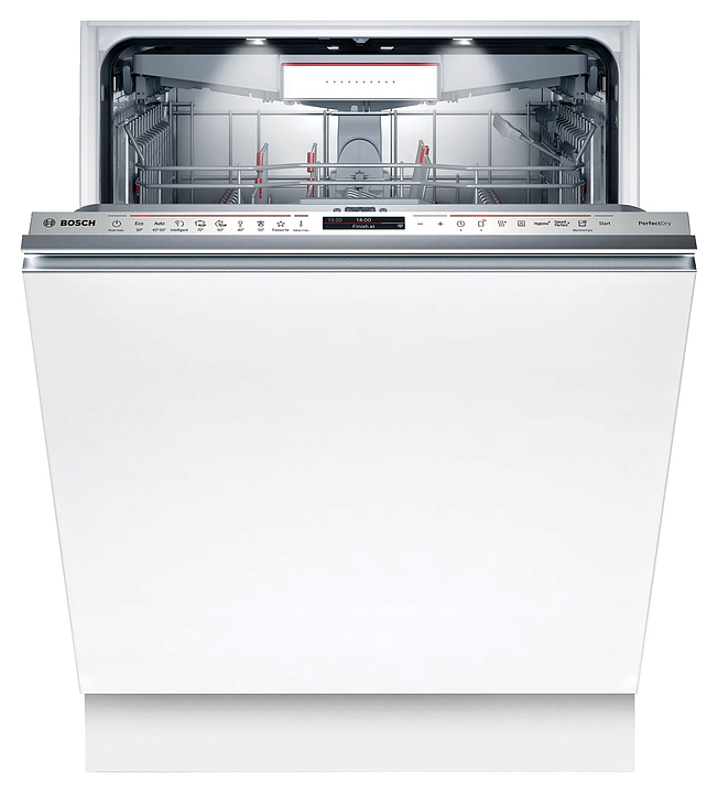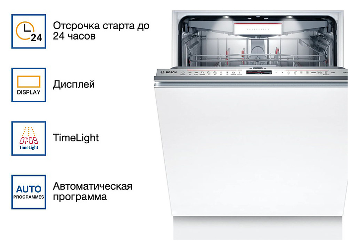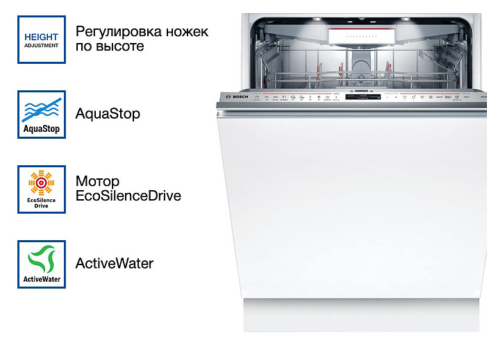 Посудомоечная машина Bosch SMV8YCX03E серии 8 предназначена для гигиенической обработки и последующей сушки различной посуды в домашних условиях. Модель оснащена инверторным двигателем EcoSilence Drive, моечной камерой с откидной дверью, закрытой панелью управления, дисплеем, сенсорными кнопками и регулируемыми по высоте ножками. Система ActiveWater использует точное количество воды, необходимое для каждой загрузки в зависимости от количества и степени загрязненности посуды, что обеспечивает эффективное мытье. Световой индикатор TimeLight позволяет отслеживать оставшееся время цикла мойки с точностью до минуты без открывания дверцы. Внутренний резервуар выполнен из нержавеющей стали. Особенности: