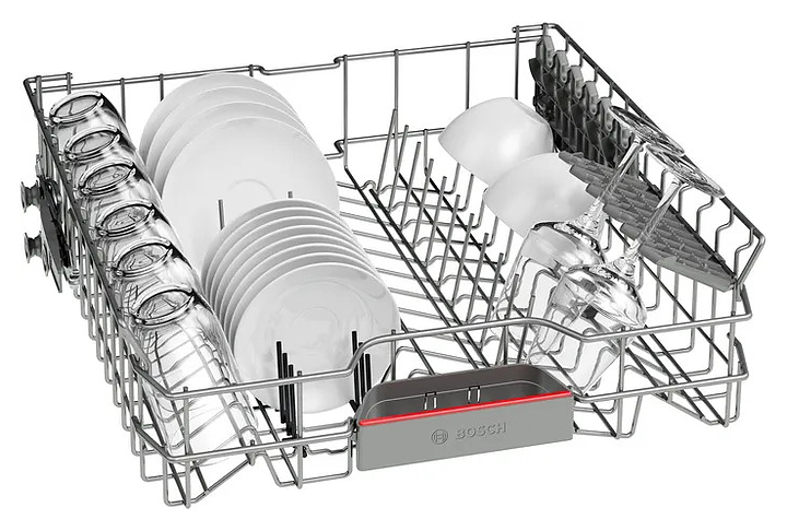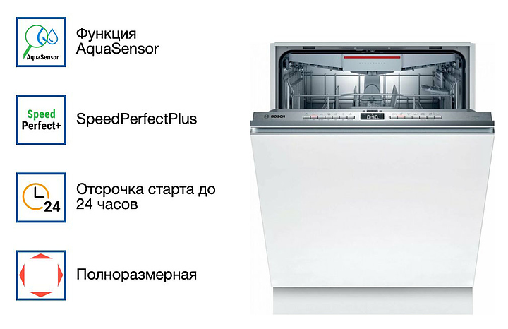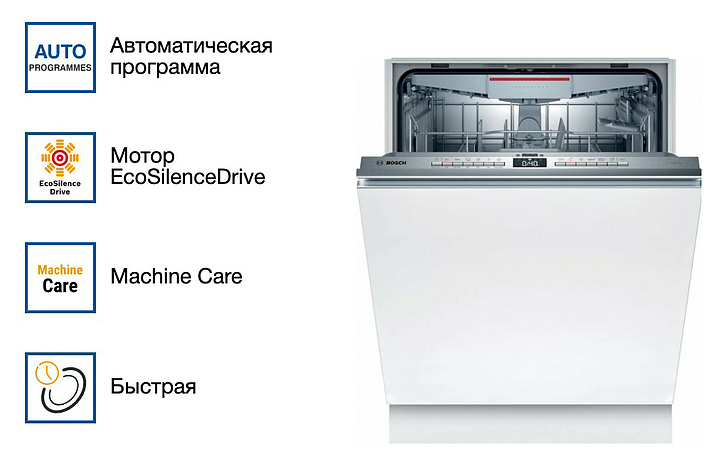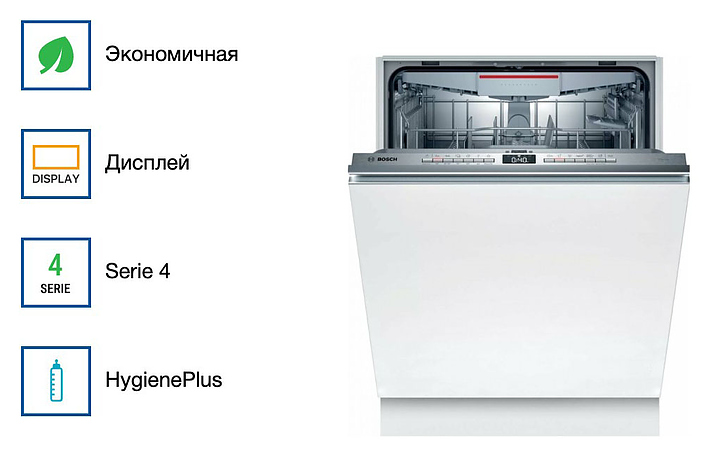 Посудомоечная машина Bosch SMV4HVX32E серии 4 предназначена для гигиенической обработки и последующей сушки различной посуды в домашних условиях. Модель оснащена инверторным двигателем EcoSilence Drive, моечной камерой с откидной дверью, закрытой панелью управления с кнопками, дисплеем и регулируемыми по высоте ножками. Световой индикатор InfoLight позволяет отслеживать завершение цикла мойки без открывания дверцы. Внутренний резервуар выполнен из нержавеющей стали и пластика. Особенности: