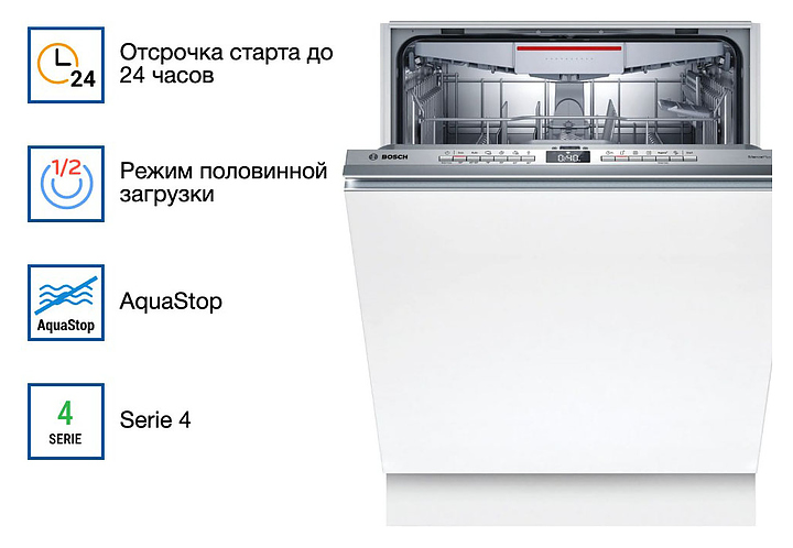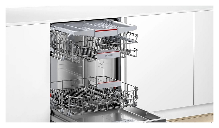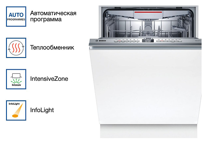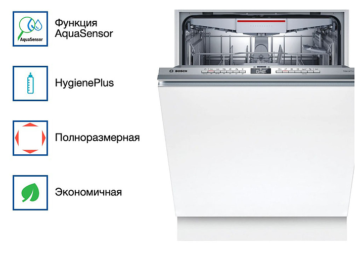Посудомоечная машина Bosch SMV4HMX65Q серии 4 предназначена для гигиенической обработки и последующей сушки различной посуды в домашних условиях. Модель оснащена инверторным двигателем EcoSilence Drive, моечной камерой с откидной дверью, закрытой панелью управления с кнопками и дисплеем. Световой индикатор InfoLight позволяет отслеживать завершение цикла мойки без открывания дверцы. Внутренний резервуар выполнен из нержавеющей стали. Особенности: