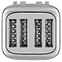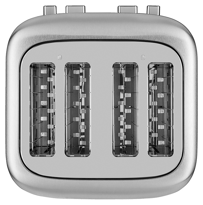 Тостер KitchenAid 5KMT4109ESX используется в офисах, гостиницах и домашних условиях для обжаривания ломтиков хлеба различных сортов. Модель оснащена кабелем питания с вилкой и 2 независимыми блоками нагрева, каждый блок имеет 2 слота для тостов и электромеханическую панель управления с рычажными рукоятками, нажимными функциональными клавишами и светодиодными индикаторами. Корпус обтекаемой прямоугольно ориентированной формы выполнен из металла и ударопрочного пластика с поверхностью оттенка нержавеющая сталь и декорирован горизонтальной серебристой полосой с логотипом по периметру основания, верхняя панель и решетки слотов – из нержавеющей стали с глянцевой серебристой поверностью, опоры – из черного полимера с матовой поверхностью, поддон для крошек – из нержавеющей стали, фурнитура с серебристой поверхностью. В комплект поставки входят инструкция по эксплуатации, гарантийный талон и заводская упаковка. Особенности: