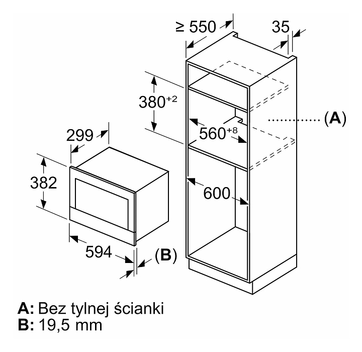 • Габариты ниши для встраивания: 380-382х560-568х550 мм