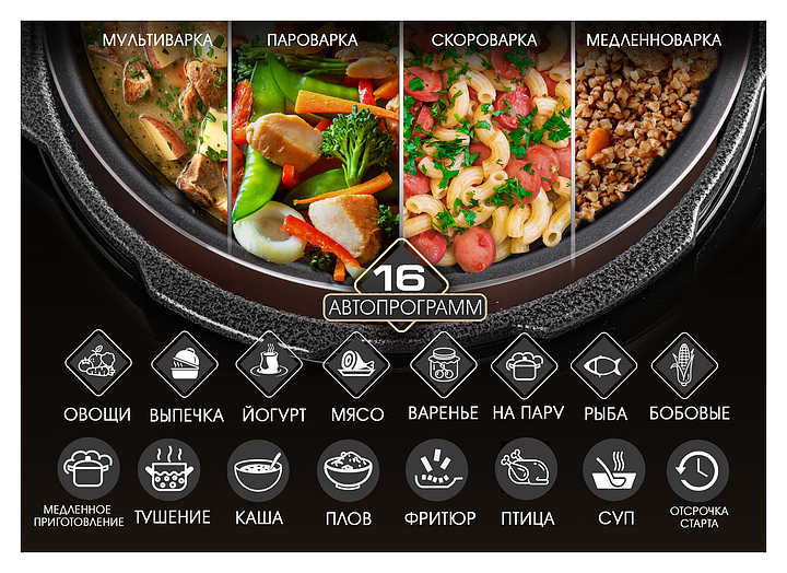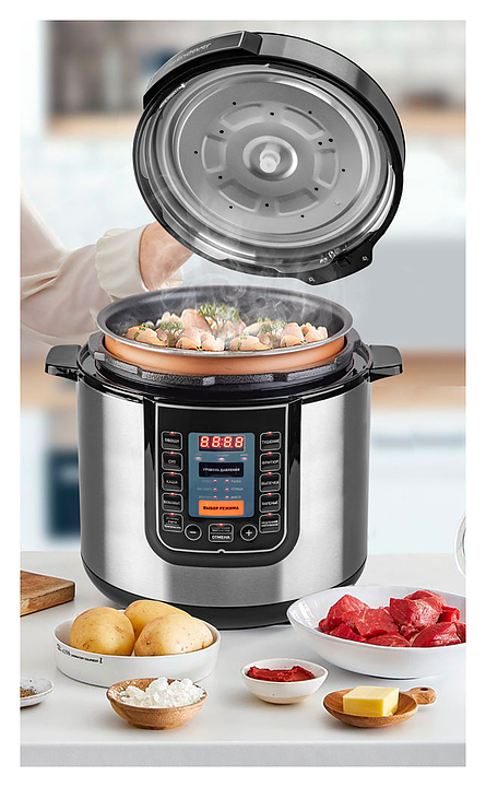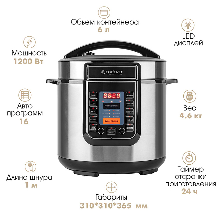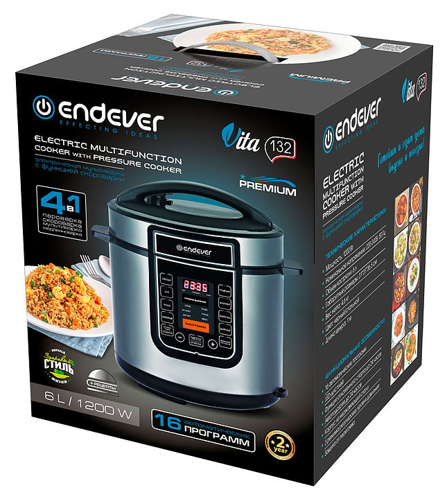 Мультиварка-скороварка ENDEVER VITA-132 предназначена для приготовления на пару, обжаривания, тушения, выпечки и варки различных продуктов в квартирах и частных домах. Модель оснащена LED-дисплеем. Функция отложенного старта позволяет задать время, через которое начнет работу заранее выбранный автоматический режим приготовления. Корпус выполнен из нержавеющей стали. В комплект поставки входят съемная чаша, контейнер-пароварка, ложка, мерный стакан и книга рецептов. Особенности:
