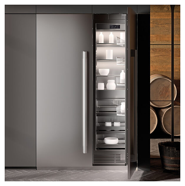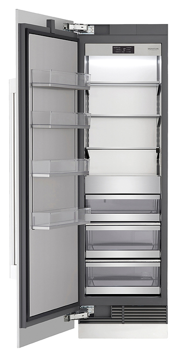 Встраиваемый морозильник SIGNATURE KITCHEN SUITE SKSCF2411P предназначен для замораживания, кратковременного и длительного хранения продуктов питания в частных домах, квартирах, отелях и офисах. Модель оснащена инверторным линейным компрессором, цифровым управлением со светодиодным дисплеем, индикатором фильтра для воды и перенавешиваемой дверью. Система принудительной циркуляции воздуха NoFrost препятствует осаждению на холодных поверхностях влаги с последующей ее кристаллизацией, что не требуют периодического размораживания. Дверные полки выполнены из алюминия. Особенности: