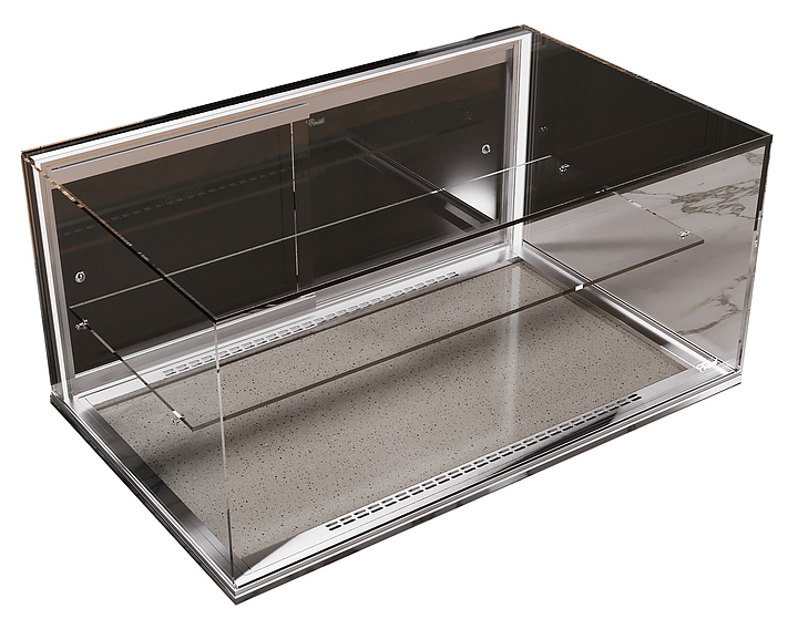 Встраиваемая горизонтальная кондитерская витрина Finist Glassier812 Stone Gst812-15/65/5 предназначена для кратковременного хранения и предпродажной демонстрации кондитерских изделий на предприятиях общественного питания и торговли. Модель оснащена закрытой холодильной камерой с навесной полкой, скрытыми под основанием камеры агрегатным отсеком, кабелем питания с вилкой и электромеханической панелью управления. Основание камеры выполнено из высококачественной нержавеющей стали с серебристой зеркальной поверхностью, столешница для выкладки – из искусственного камня, корпус агрегатного отсека – из стали с антикоррозийным покрытием белого цвета (RAL 9016). Особенности: