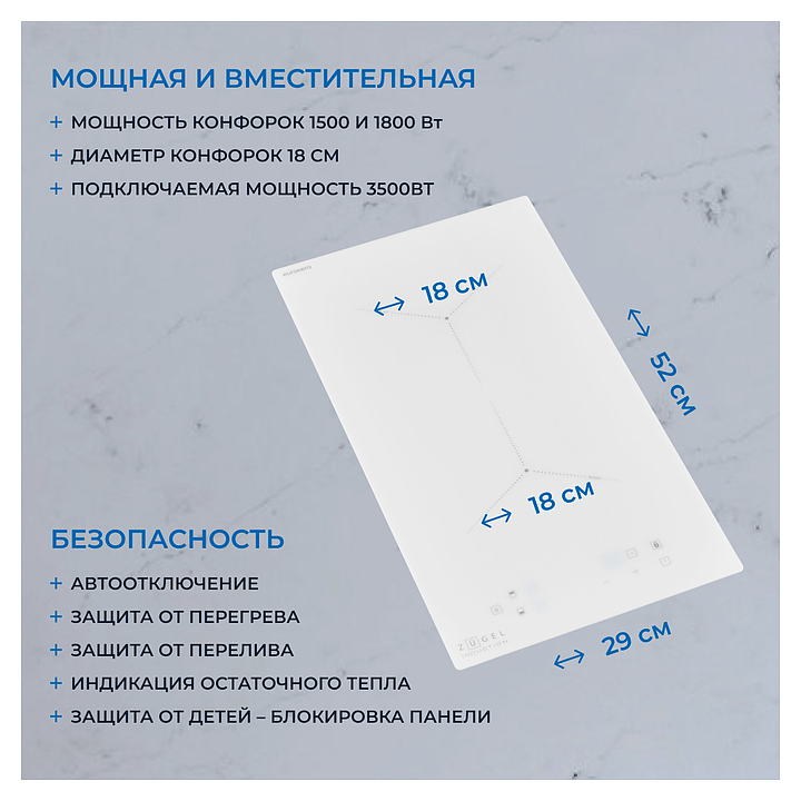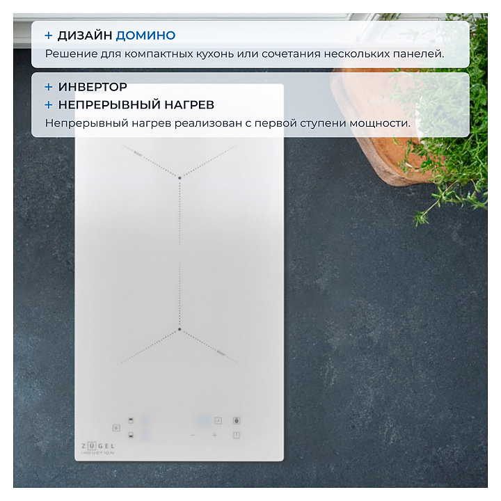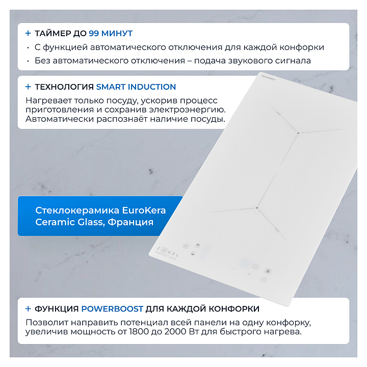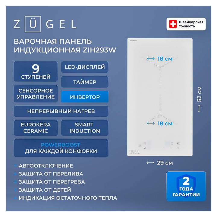 Варочная панель Zugel ZIH293W предназначена для приготовления большого ассортимента блюд в наплитной посуде в домашних условиях. Модель оснащена сенсорным управлением, LED дисплеем и таймером. Индукционная технология Smart Induction обеспечивает передачу до 90% энергии непосредственно посуде, что значительно экономит электроэнергию по сравнению с традиционными плитами. Отсутствие открытого огня и минимальный нагрев окружающей среды делают приготовление пищи более безопасным и комфортным. Режим усиленного нагрева PowerBoost для повышения мощности на одну конфорку. Поверхность выполнена из высококачественной стеклокерамики Vitro Ceramic Glass, выдерживающей высокие температурные и физические нагрузки.