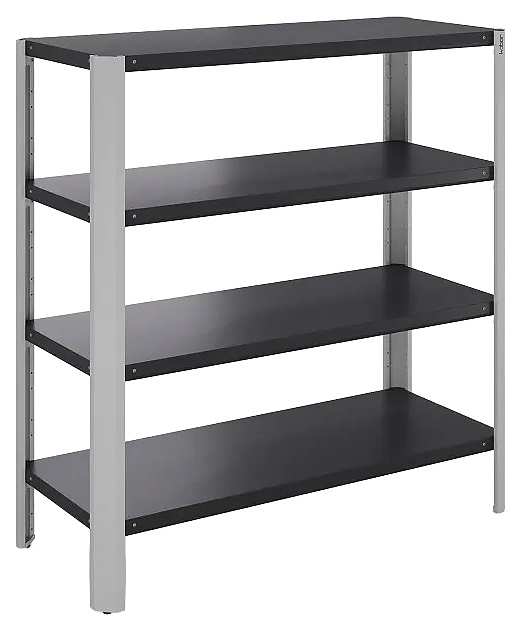 Стеллаж Kobor Expert MR4-80/60 предназначен для хранения инструментов, инвентаря, комплектующих, расходных материалов, штучных изделий или тарированных мелких грузов в производственных, складских и подсобных помещениях предприятий различных отраслей, мастерских и гаражах, а также для хранения документации в офисах и архивах. Модель оснащена 4 сплошными полками. Полки выполнены из стали с покрытием порошковой краской черного цвета (RAL 9005) с текстурой муар и усилены подштамповками, каркасные стойки – из стального профиля с порошковой краской светло-серого оттенка (RAL 7035) с текстурой муар. Особенности: