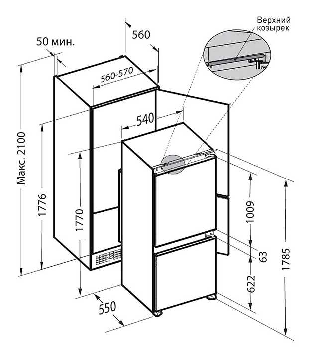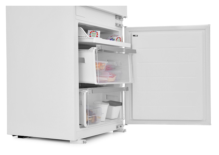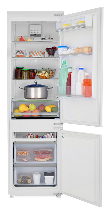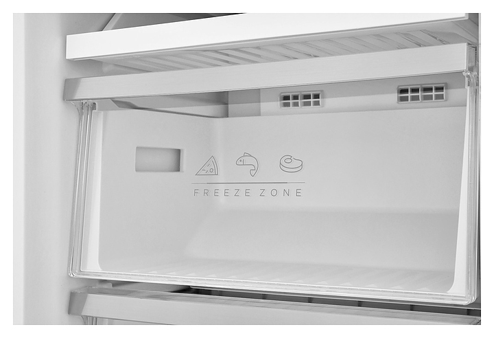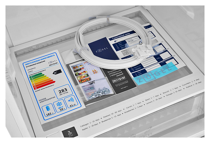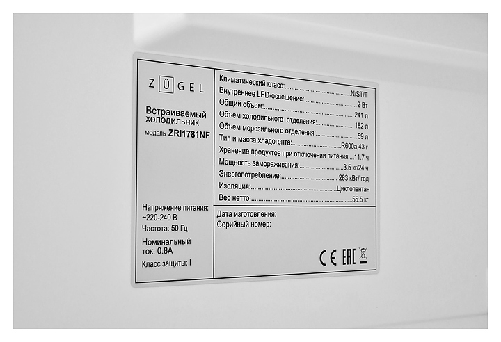 Встраиваемый холодильник Zugel ZRI1781NF предназначен для охлаждения, замораживания, длительного и кратковременного хранения продуктов питания в частных домах, квартирах, отелях и офисах. Модель оснащена холодильной камерой сверху, морозильной камерой снизу, электронным сенсорным управлением, LED-дисплеем и внутренним светодиодным освещением. Система принудительной циркуляции воздуха No Frost препятствует осаждению на холодных поверхностях влаги с последующей ее кристаллизацией, что не требуют периодического размораживания. Полки выполнены из закаленного стекла. Особенности: