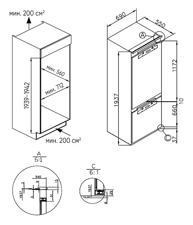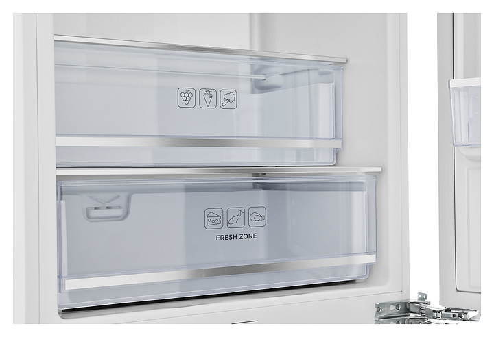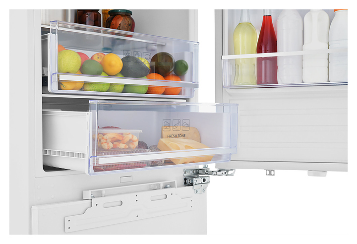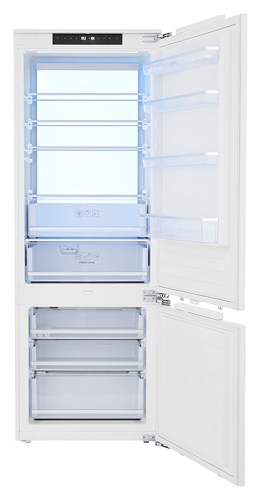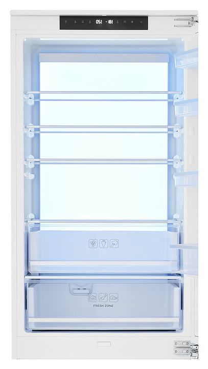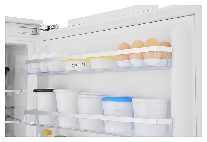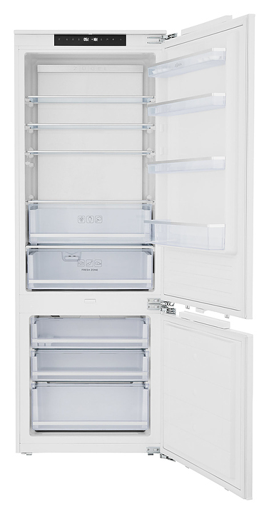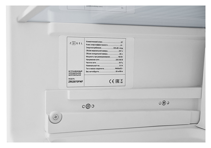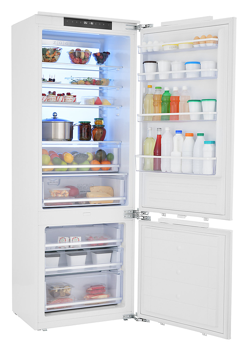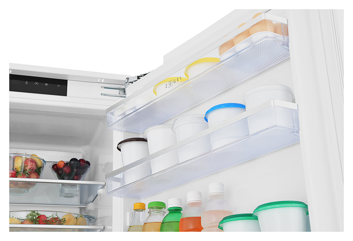 Встраиваемый холодильник Zugel ZRI2070FNF предназначен для охлаждения, замораживания, длительного и кратковременного хранения продуктов питания в частных домах, квартирах, отелях и офисах. Модель оснащена холодильной камерой сверху, морозильной камерой снизу, электронным сенсорным управлением, LED-дисплеем и регулируемыми ножками. Инверторный компрессор снижает уровень шума, износа и энергопотребления, увеличивает срок службы. Система принудительной циркуляции воздуха No Frost препятствует осаждению на холодных поверхностях влаги с последующей ее кристаллизацией, что не требуют периодического размораживания. Полки выполнены из закаленного стекла, отделка ящиков и полок - из стали, телескопические направляющие - из металла. Особенности: