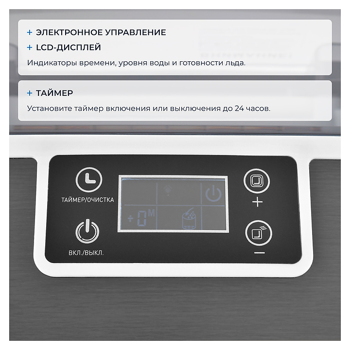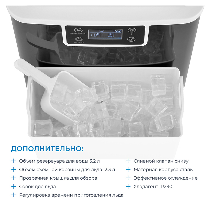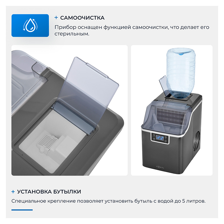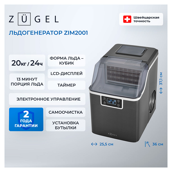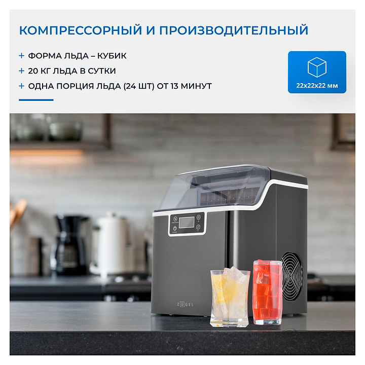 Льдогенератор Zugel ZIM2001 предназначен для получения кубикового льда, который используется для приготовления разнообразных коктейлей, алкогольных и прохладительных напитков в частных домах, квартирах, отелях и офисах. Модель оснащена электронным управлением, ЖК-дисплеем и прозрачной крышкой для контроля за процессом приготовления. На корпусе можно установить бутыль объемом до 5 л для постоянного наполнения резервуара водой, что позволяет сделать процесс приготовления льда непрерывным и автоматическим. Корпус выполнен из стали, пенообразователь - циклопентан. Особенности: