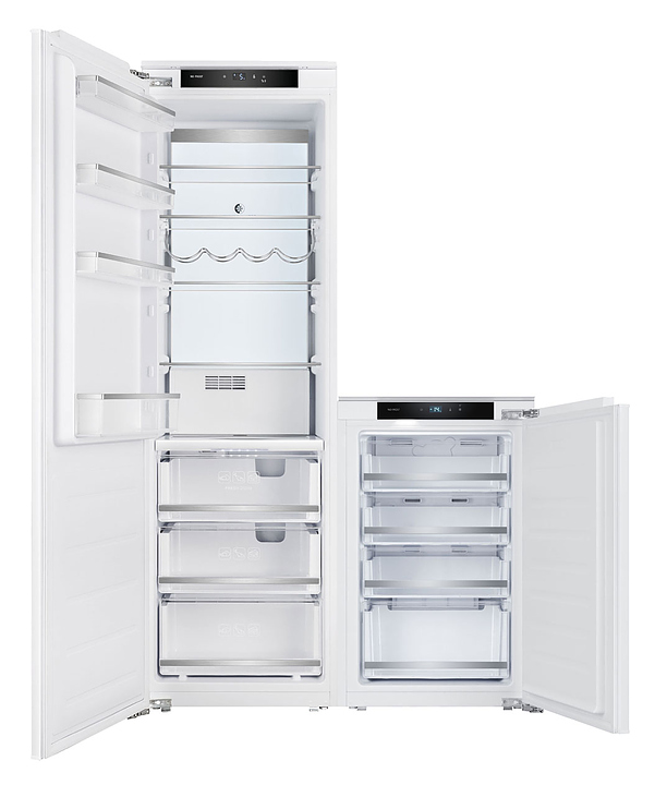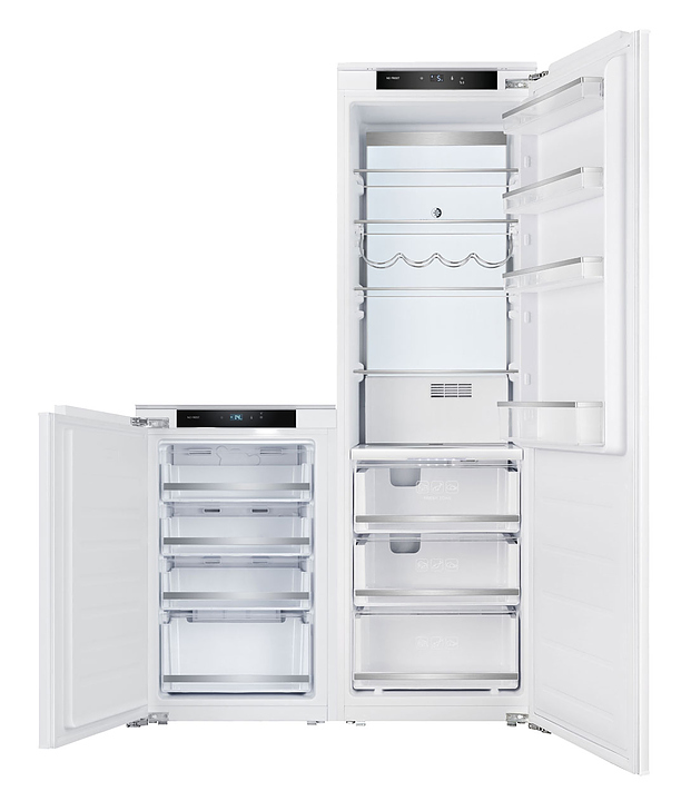 Встраиваемый холодильник Zugel ZRISS363FNF предназначен для охлаждения, замораживания, кратковременного и длительного хранения продуктов питания в частных домах, квартирах, отелях и офисах. Модель оснащена электронным сенсорным управлением, LED-дисплеем, внутренним светодиодным освещением и регулируемыми ножками. Инверторный компрессор снижает уровень шума, износа и энергопотребления, увеличивает срок службы. Система принудительной циркуляции воздуха NoFrost препятствует осаждению на холодных поверхностях влаги с последующей ее кристаллизацией, что не требуют периодического размораживания. Полки выполнены из закаленного стекла, отделка полок и ящиков - из стали. В комплект поставки входят холодильники ZRI1750NF и ZFI870NF. Особенности: