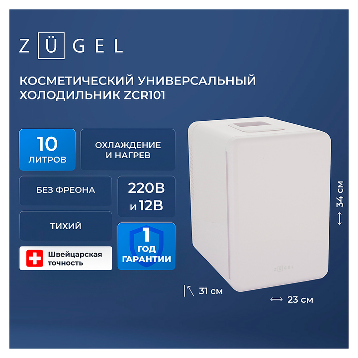Холодильник Zugel ZCR101 используется в специализированных салонах, офисах, гостиницах и в домашних условиях для хранения и транспортировки широкого спектра косметических средств с ограниченным сроком годности, для охлаждения пищевых продуктов и сохранения тепла в режиме нагрева необходимых материалов и продуктов. Модель оснащена вертикально ориентированной камерой, 2 полками и складной ручкой для переноски. Бесщеточный двигатель гарантирует бесшумную работу без перегрева и искрообразования. Корпус выполнен из прочного ABS-пластика, изоляция - из пенополиуретана.