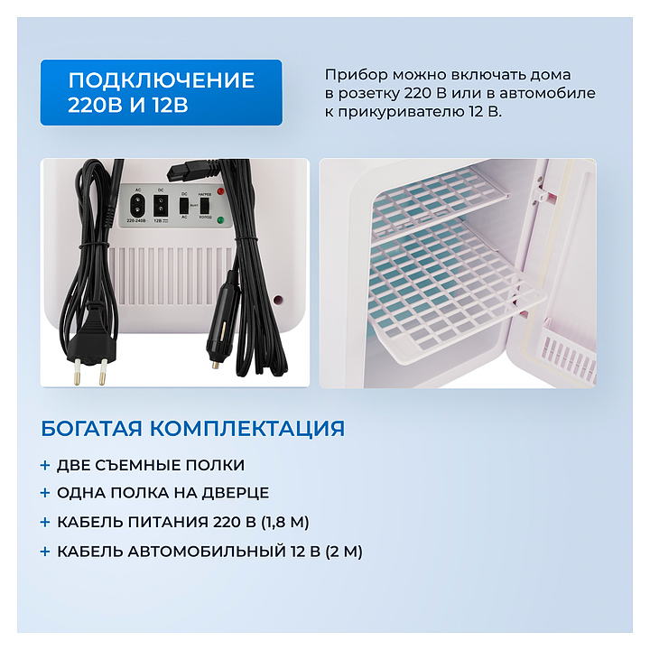 В комплект поставки входят сетевой и автомобильный кабели питания.