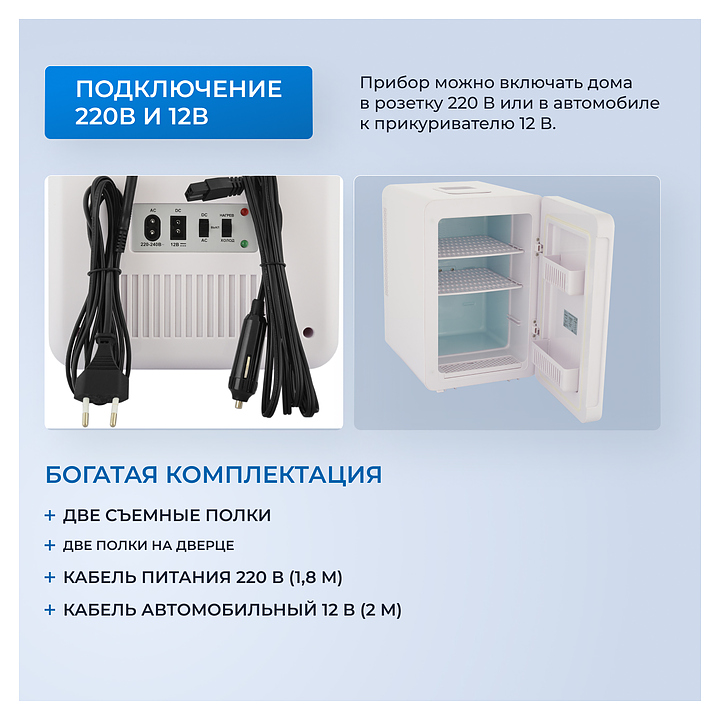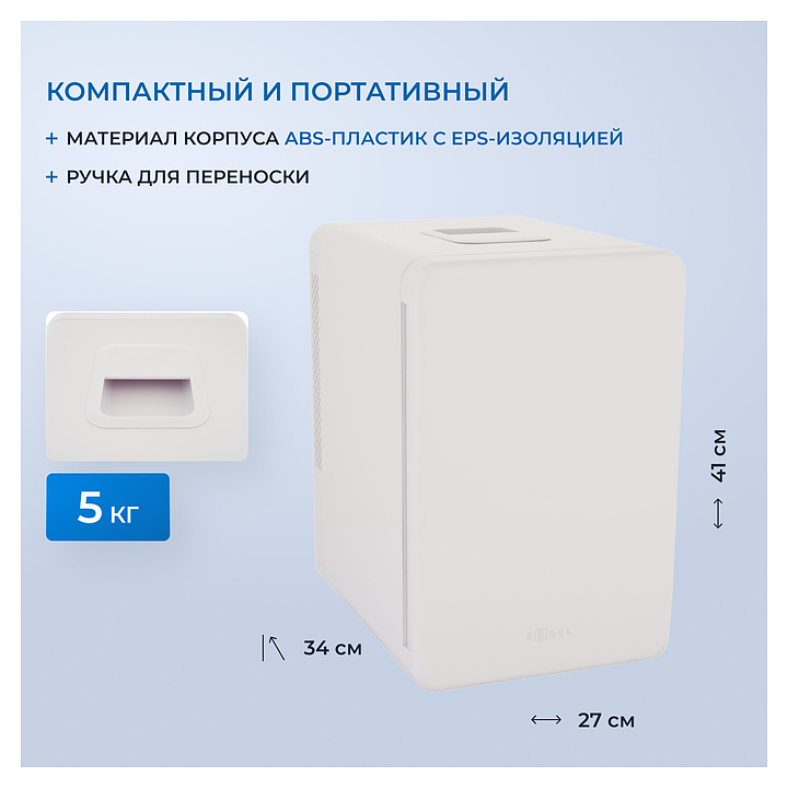 Холодильник Zugel ZCR15 используется в специализированных салонах, офисах, гостиницах и в домашних условиях для хранения и транспортировки широкого спектра косметических средств с ограниченным сроком годности, для охлаждения пищевых продуктов, лекарственных препаратов и сохранения тепла в режиме нагрева необходимых материалов и продуктов. Модель оснащена вертикально ориентированной камерой, 2 полками и складной ручкой для переноски. Бесщеточный двигатель гарантирует бесшумную работу без перегрева и искрообразования. Корпус выполнен из прочного ABS-пластика, изоляция - из пенополиуретана. В комплект поставки входят сетевой и автомобильный кабели питания. Особенности: