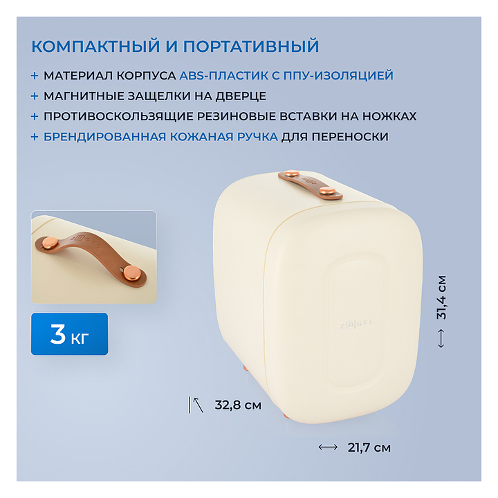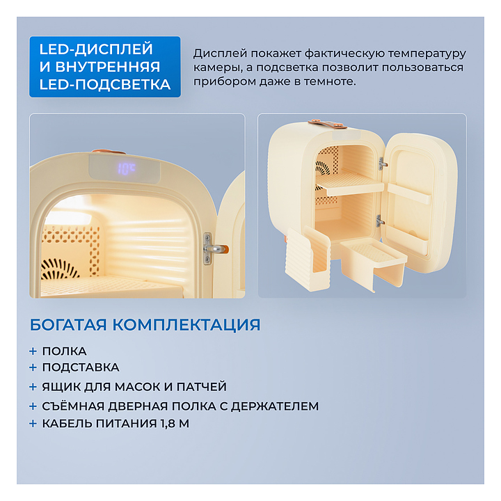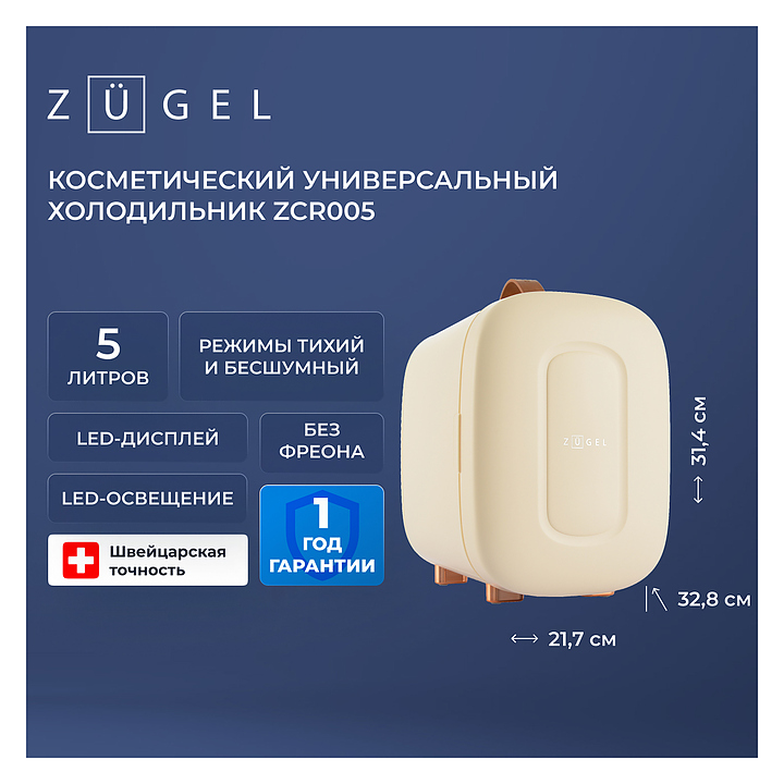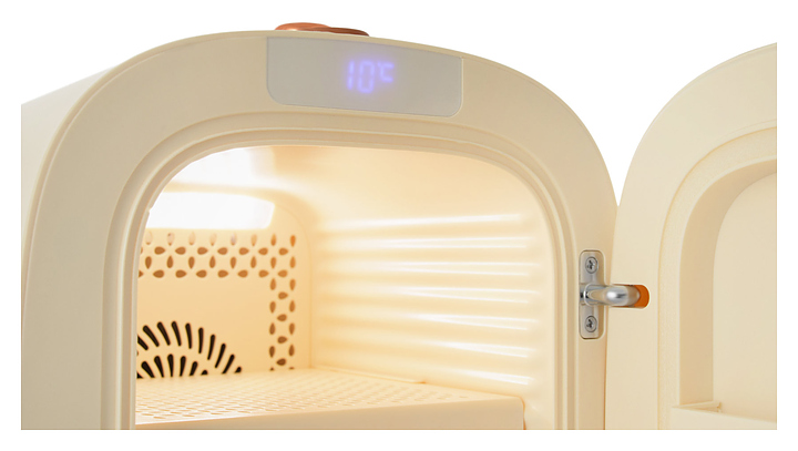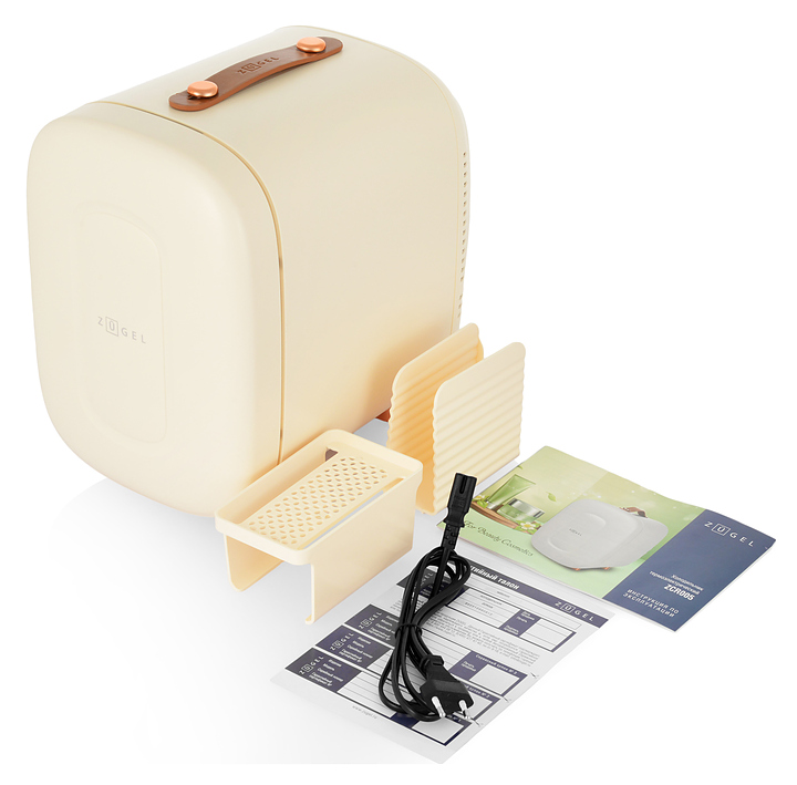 Холодильник Zugel ZCR005 используется в специализированных салонах, офисах, гостиницах и в домашних условиях для охлаждения, хранения и транспортировки широкого спектра косметических и лекарственных средств с ограниченным сроком годности. Модель оснащена вертикально ориентированной камерой, полкой, LED-дисплеем, внутренним светодиодным освещением и ручкой для переноски. Бесщеточный двигатель гарантирует бесшумную работу без перегрева и искрообразования. Ножки с противоскользящим покрытием обеспечивают устойчивость и безопасность. Магнитные защелки гарантируют герметичное закрывание дверцы и постоянное поддержание оптимальной температуры. Корпус выполнен из прочного ABS-пластика, изоляция - из пенополиуретана. В комплект поставки входят сетевой кабель питания, 1 полка, 1 подставка, 1 дверная полочка с держателем, 1 ящик для масок и патчей. Особенности: