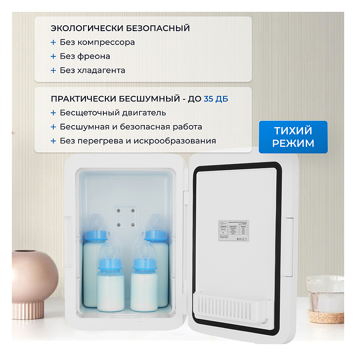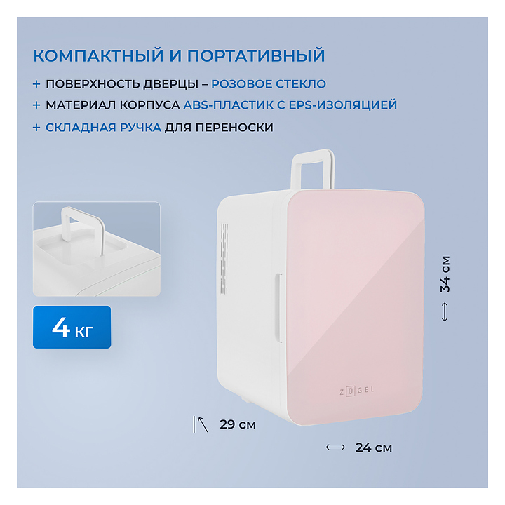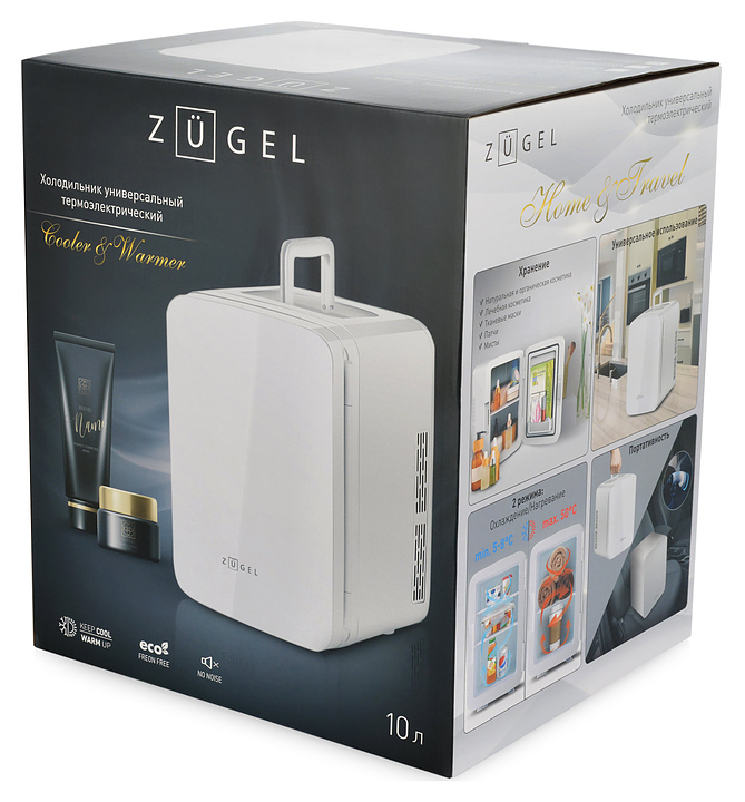 Холодильник Zugel ZCR-001 используется в специализированных салонах, офисах, гостиницах и в домашних условиях для хранения и транспортировки широкого спектра косметических средств с ограниченным сроком годности, для охлаждения пищевых продуктов, лекарственных препаратов и сохранения тепла в режиме нагрева необходимых материалов и продуктов. Модель оснащена вертикально ориентированной камерой, 2 полками и складной ручкой для переноски. Бесщеточный двигатель гарантирует бесшумную работу без перегрева и искрообразования. Корпус выполнен из прочного ABS-пластика с EPS-изоляцией, поверхность дверцы - из закаленного стекла. В комплект поставки входят сетевой и автомобильный кабели питания. Особенности: