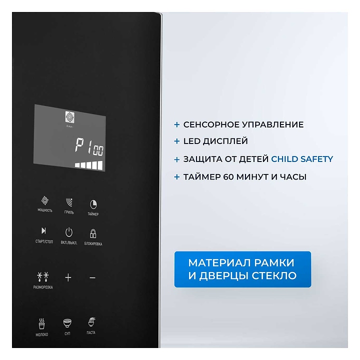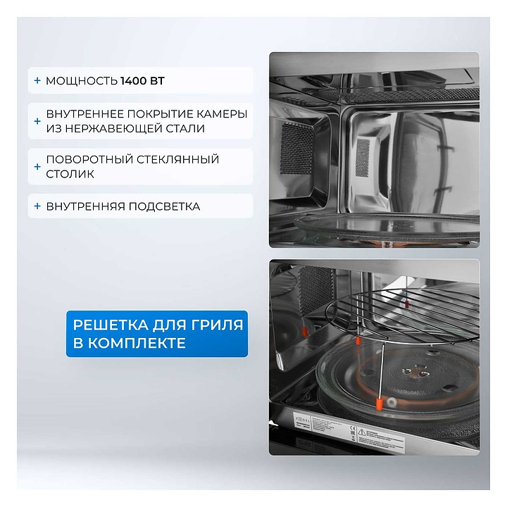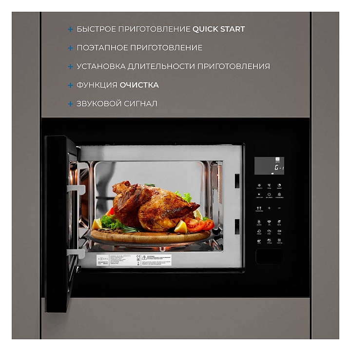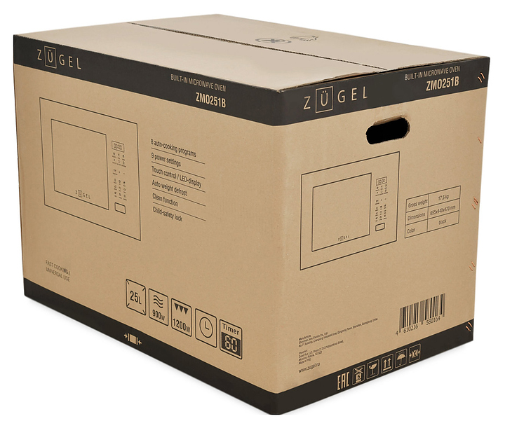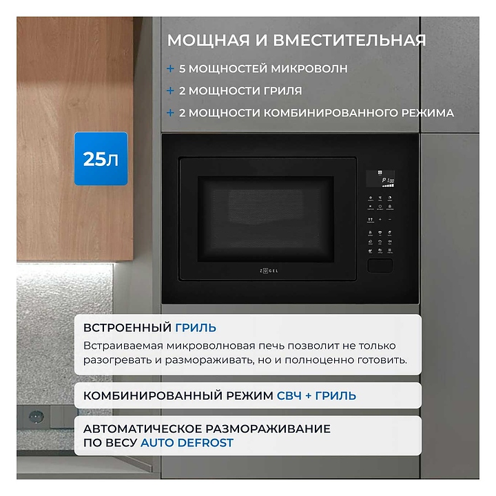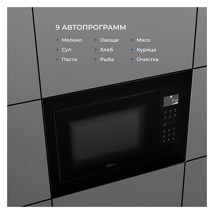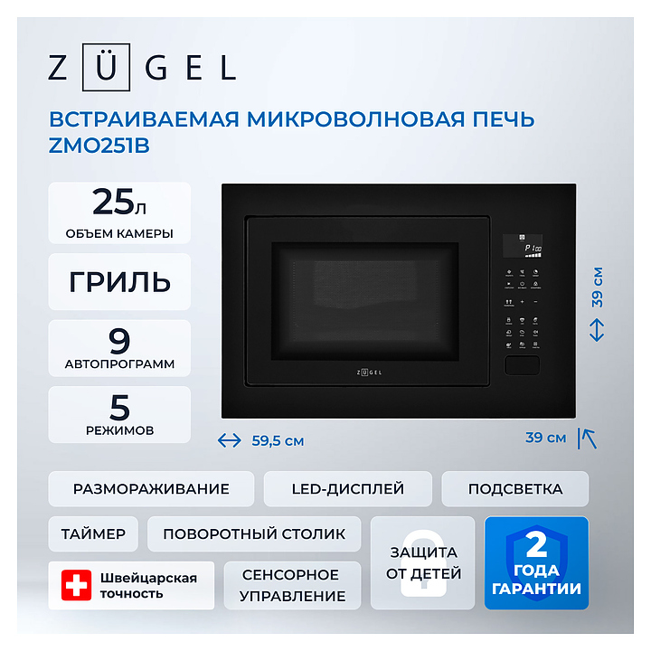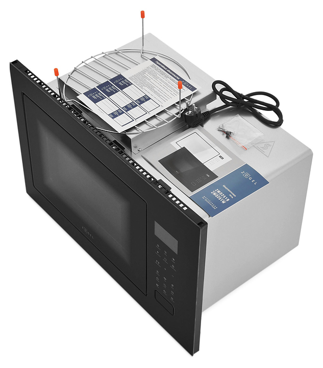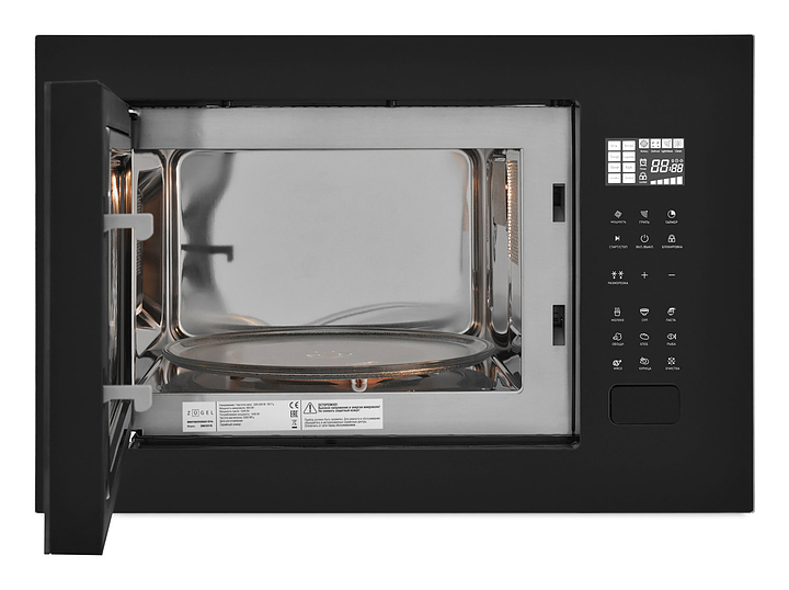 Встраиваемая микроволновая печь Zugel ZMO251B предназначена для приготовления пищи, подогрева готовых блюд и ингредиентов, а также размораживания полуфабрикатов в частных домах, квартирах, отелях и офисах. Модель оснащена электронным управлением с сенсорными кнопками, LED дисплеем, часами, таймером и внутренним освещением. Внутреннее покрытие выполнено из нержавеющей стали, дверца и внешняя рамка - из стекла. В комплект поставки входят стеклянный поворотный стол и решетка для гриля. Особенности: