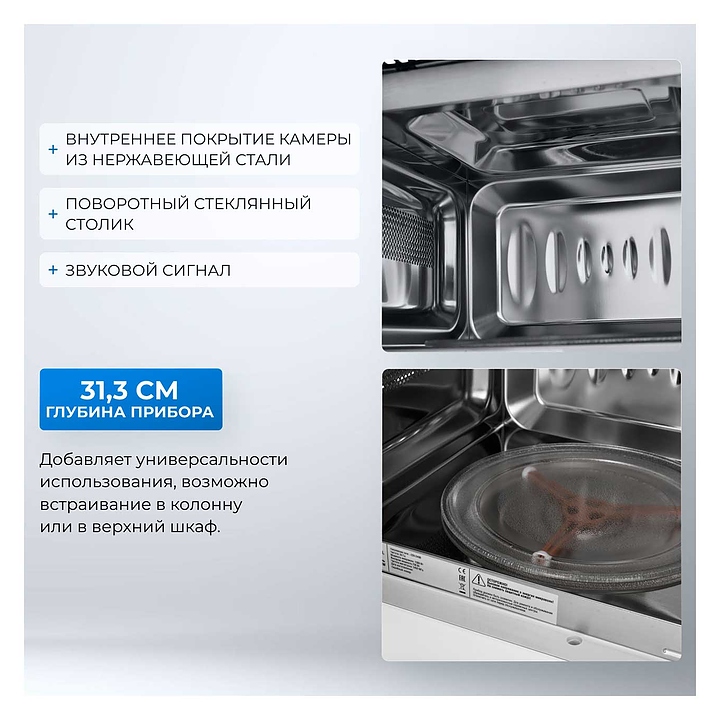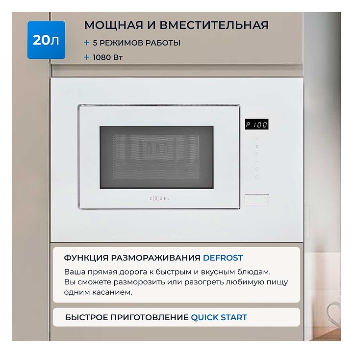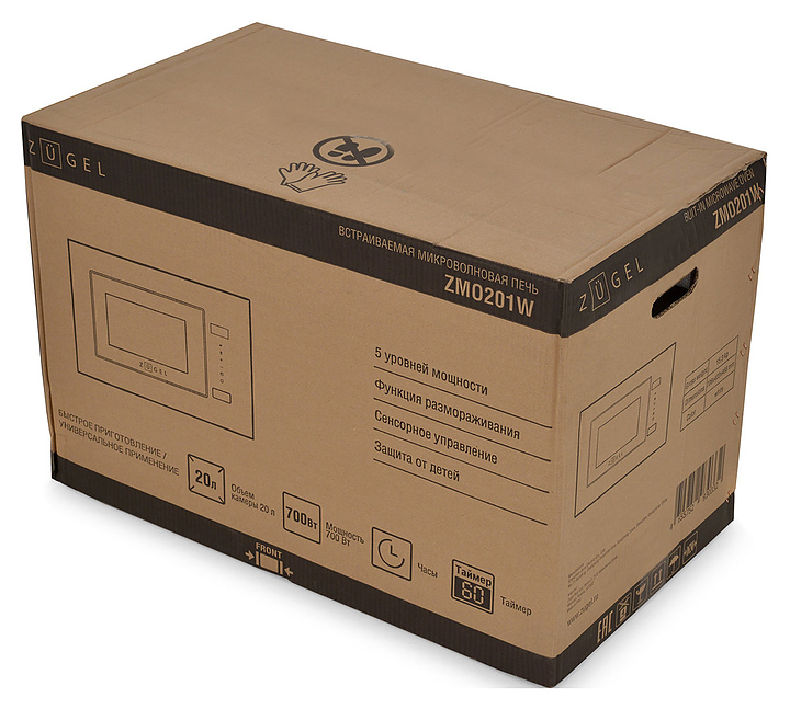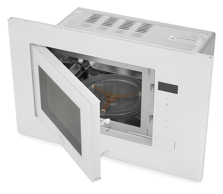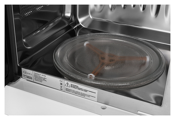 Встраиваемая микроволновая печь Zugel ZMO201W предназначена для приготовления пищи, подогрева готовых блюд и ингредиентов, а также размораживания полуфабрикатов в частных домах, квартирах, отелях и офисах. Модель оснащена электронным управлением с сенсорными кнопками, LED дисплеем, часами и таймером. Внутреннее покрытие выполнено из нержавеющей стали, дверца, поворотный стол и внешняя рамка - из стекла. В комплект поставки входит поворотный стол. Особенности: