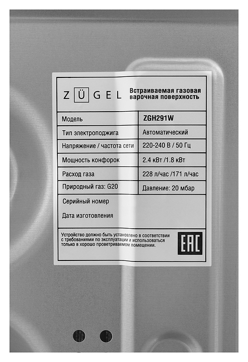 Панель варочная Zugel ZGH291W