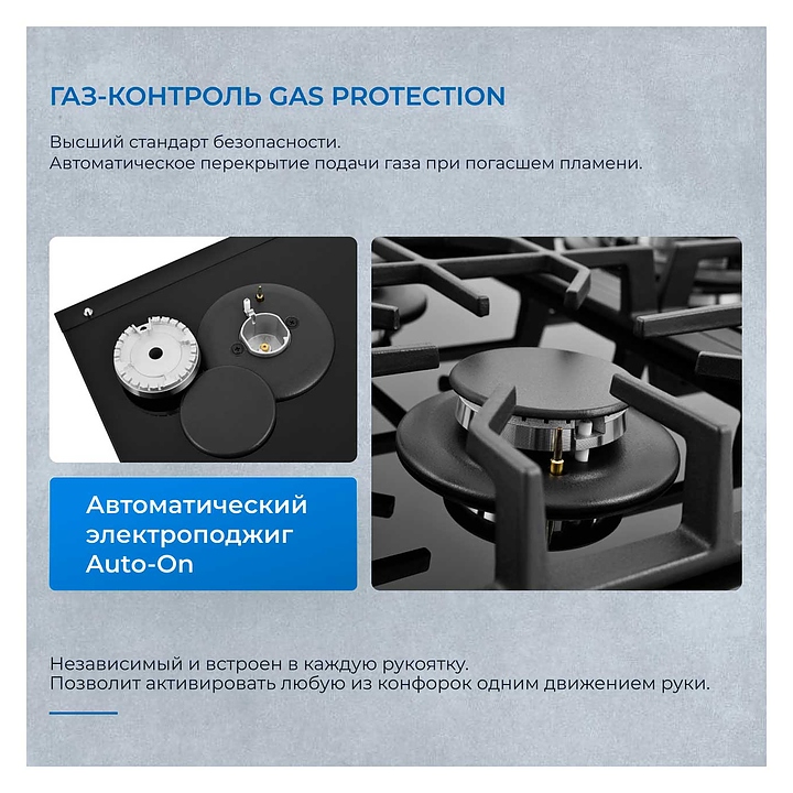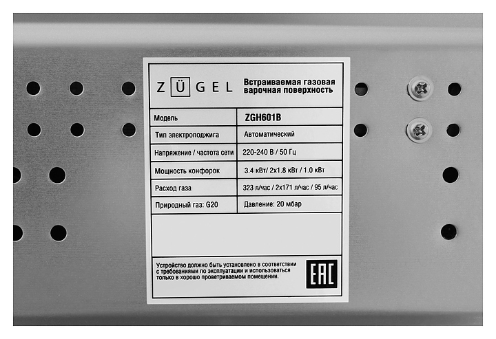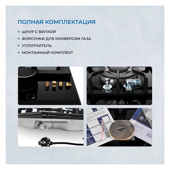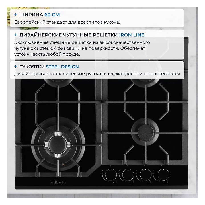 Варочная панель Zugel ZGH601B предназначена для приготовления большого ассортимента блюд в наплитной посуде в домашних условиях. Модель оснащена механическим управлением, 4 конфорками разной мощности, автоматическим электроподжигом Auto-On и рукоятками Steel Design. Мощная Вок-конфорка с 2 рассекателями и тройным контуром огня создает сильное пламя для приготовления в посуде большого объема. Газ-контроль Gas Protection автоматически перекрывает подачу газа при погасшем пламени. Рабочая поверхность выполнена из закаленного стекла, решетки - из чугуна, рукоятки - из бакелита. В комплект поставки входят шнур с вилкой, форсунки для конверсии газа, уплотнитель и монтажный комплект. Особенности: