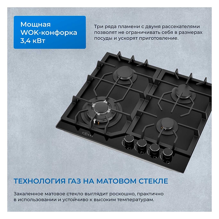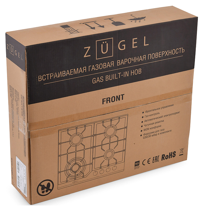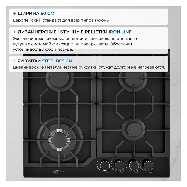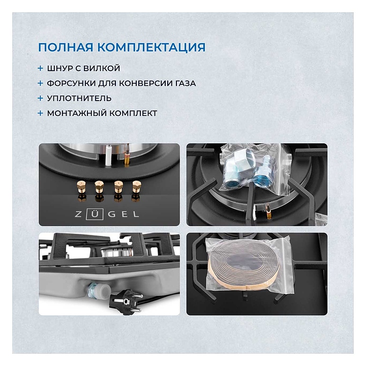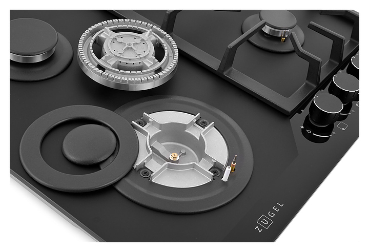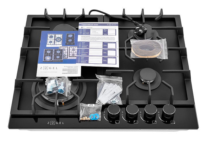 Варочная панель Zugel ZGH602B предназначена для приготовления большого ассортимента блюд в наплитной посуде в домашних условиях. Модель оснащена механическим управлением, 4 конфорками разной мощности, автоматическим электроподжигом Auto-On и рукоятками Steel Design. Мощная Вок-конфорка с 2 рассекателями и тройным контуром огня создает сильное пламя для приготовления в посуде большого объема. Газ-контроль Gas Protection автоматически перекрывает подачу газа при погасшем пламени. Рабочая поверхность выполнена из закаленного стекла, решетки - из чугуна, рукоятки - из металла. В комплект поставки входят шнур с вилкой, форсунки для конверсии газа, уплотнитель и монтажный комплект. Особенности: