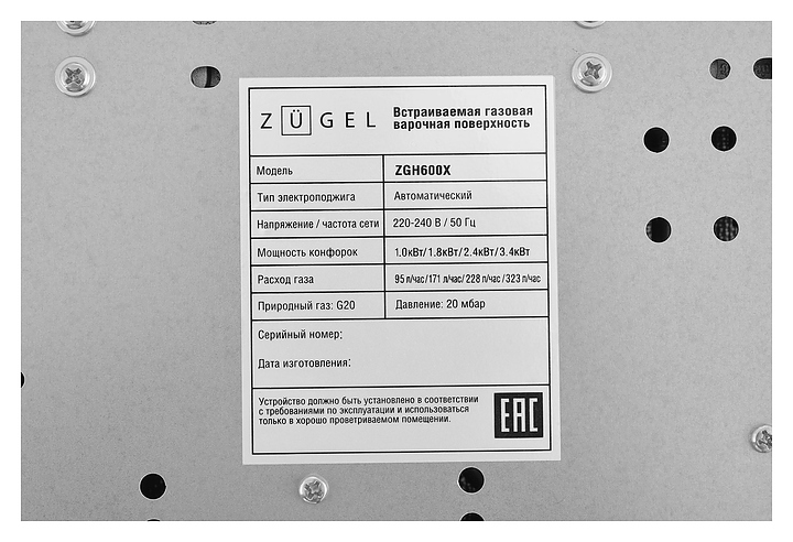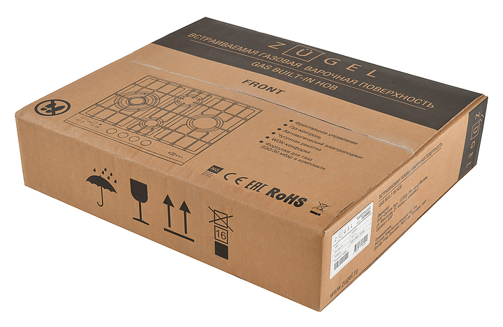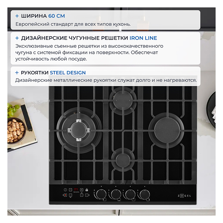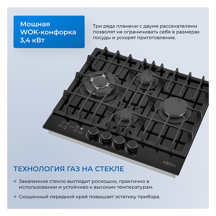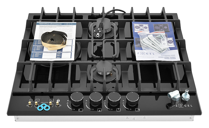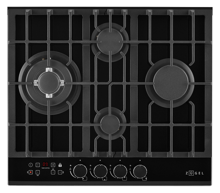 Варочная панель Zugel ZGH600X предназначена для приготовления большого ассортимента блюд в наплитной посуде в домашних условиях. Модель оснащена механическим управлением, 4 конфорками разной мощности, электронным таймером, автоматическим электроподжигом Auto-On и рукоятками Steel Design. Газ-контроль Gas Protection автоматически перекрывает подачу газа при погасшем пламени. Мощная Вок-конфорка с 2 рассекателями и тройным контуром огня создает сильное пламя для приготовления в посуде большого объема. Рабочая поверхность выполнена из закаленного стекла, решетки - из чугуна, рукоятки - из стали. В комплект поставки входят шнур с вилкой, форсунки для конверсии газа, уплотнитель и монтажный комплект. Особенности: