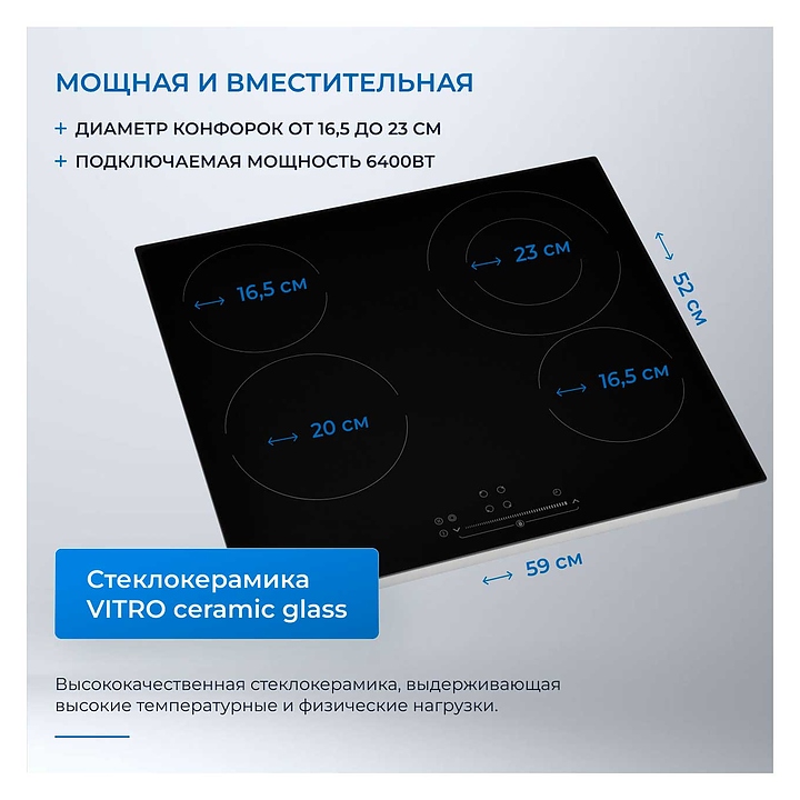 • Диаметр конфорок: 200, 165, 138 (с расширением 230) мм