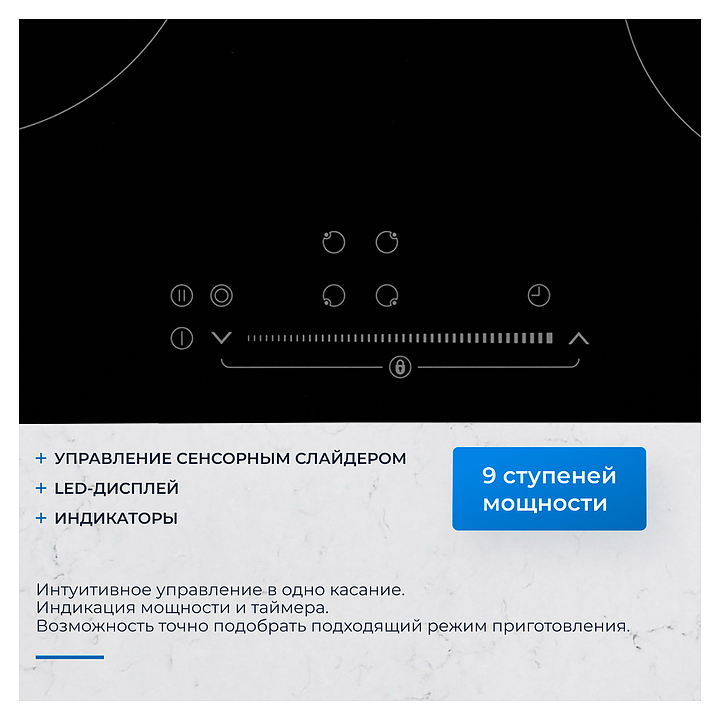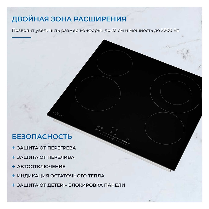 Варочная панель Zugel ZEH602B предназначена для приготовления большого ассортимента блюд в наплитной посуде в домашних условиях. Модель оснащена сенсорным слайдером, LED-дисплеем, индикаторами мощности, таймера и остаточного тепла. Технология Hi Light обеспечивает быстрый нагрев без потери мощности, радиальная зона расширения увеличивает размер конфорки и мощность. Поверхность выполнена из стеклокерамики Vitro Ceramic Glass, устойчивой к высоким температурным и физическим нагрузкам.