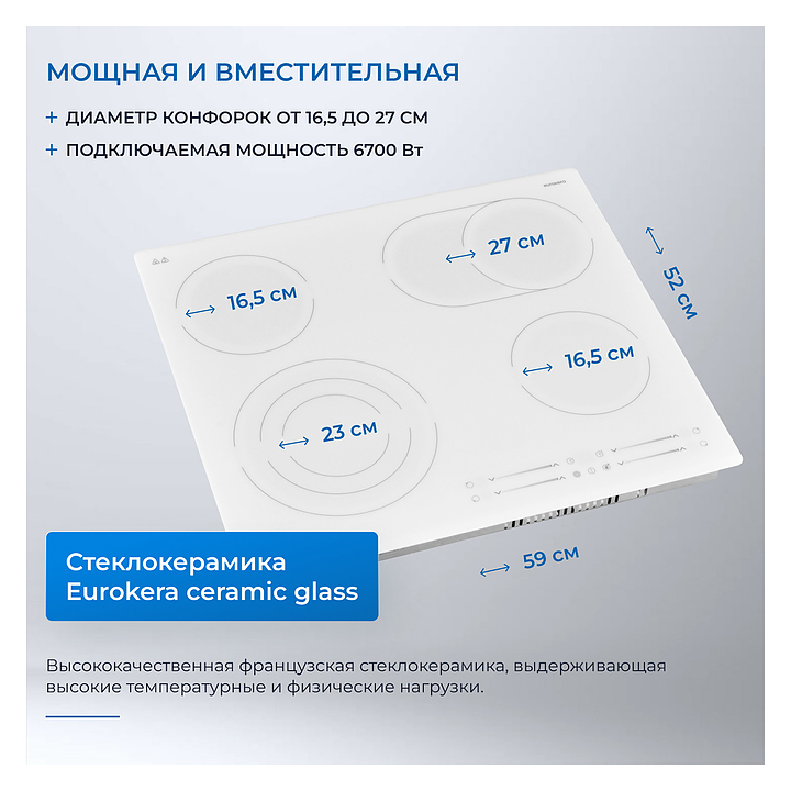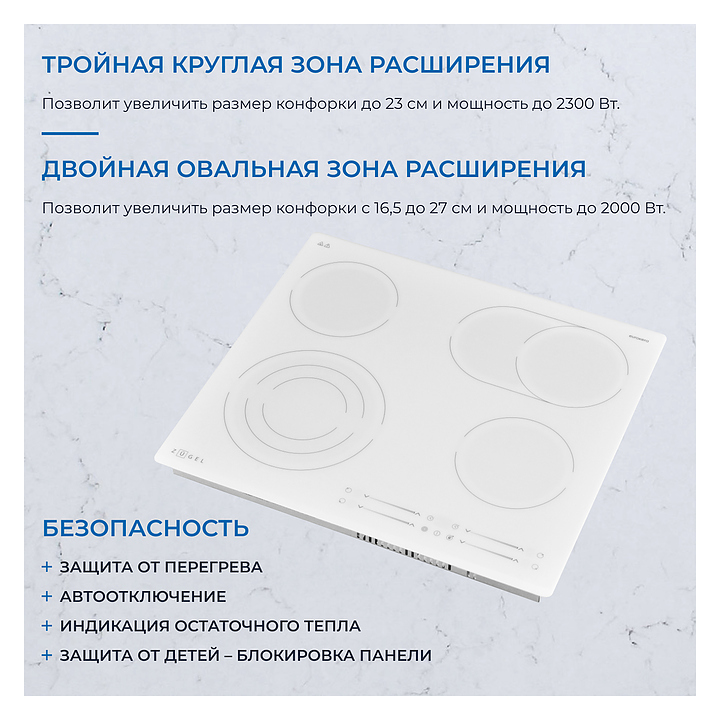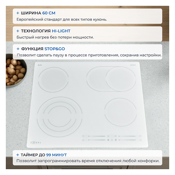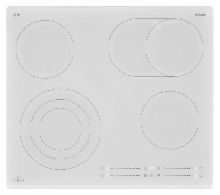 Варочная панель Zugel ZEH603W предназначена для приготовления большого ассортимента блюд в наплитной посуде в домашних условиях. Модель оснащена сенсорными слайдерами для каждой конфорки, LED-дисплеем, индикаторами мощности, таймера и остаточного тепла. Технология Hi Light обеспечивает быстрый нагрев без потери мощности, тройная и овальная зоны расширения увеличивают размер конфорки и мощность. Поверхность выполнена из стеклокерамики EuroKera Ceramic Glass, устойчивой к высоким температурным и физическим нагрузкам.