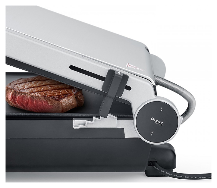 Гриль CASO SteakMaster Pro используется в частных домах и квартирах для жарки мяса, рыбы и овощей. Модель оснащена цифровой сенсорной светодиодной панелью с готовыми программами, встроенным термощупом для точного контроля прожарки и съемным поддоном для жира. XXL-поверхность обеспечивает одновременное приготовление большого количества пищи, подвижный шарнир гарантирует равномерную прожарку продуктов разной толщины. Съемные пластины с антипригарным покрытием можно мыть в посудомоечной машине. Корпус выполнен из анодированного алюминия. В комплект поставки входит лопатка. Особенности: