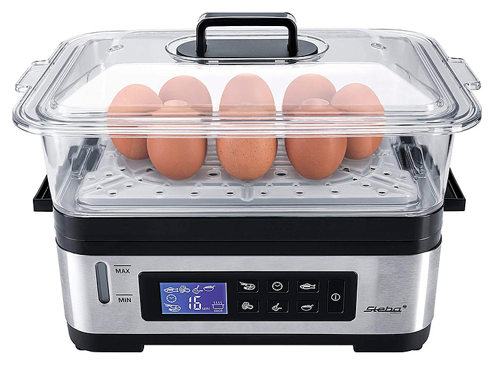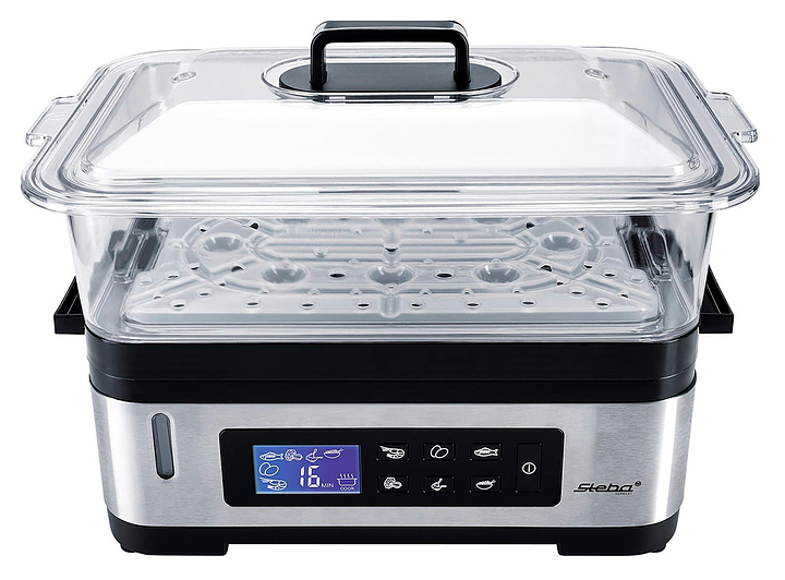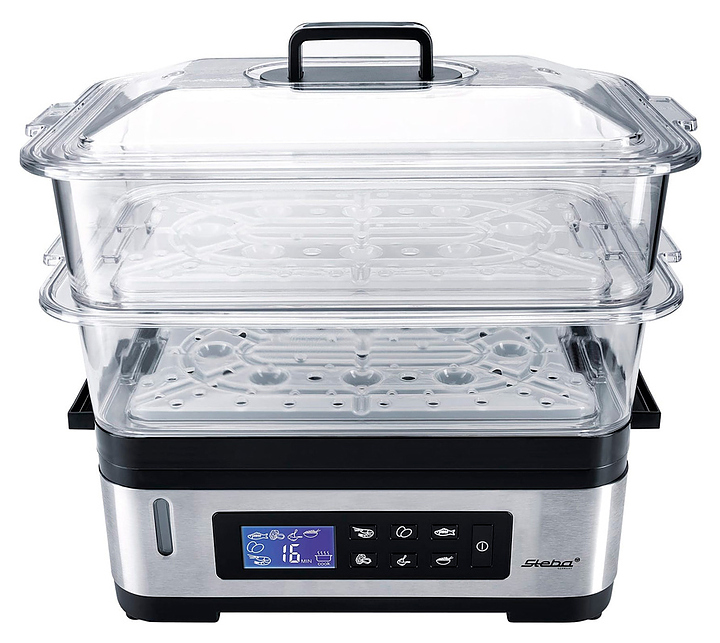 Пароварка Steba DG 2 предназначена для приготовления продуктов на пару и без жира, с сохранением полезных витаминов и минералов. Модель оснащена 2 прозрачными съемными чашами для приготовления, ЖК-дисплеем, таймером, индикатором уровня воды и внешним отверстием для долива воды. Корпус выполнен из нержавеющей стали. Особенности: