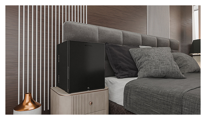 Минибар MEYVEL MMT-60B предназначен для охлаждения и кратковременного хранения скоропортящихся продуктов и напитков в отелях и гостевых домах. Модель оснащена глухой распашной дверью с утопленной ручкой, внутренним освещением, регулируемыми полками и замком. Гибридная технология обеспечивает равномерное охлаждение, экономичность и бесшумную работу. Автоматическая разморозка избавляет от необходимости вручную удалять наледь, что упрощает уход за устройством. Полки выполнены из стекла, покрытие двери - из матового стекла. Особенности: