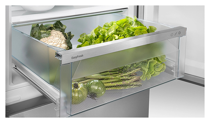 Контейнер EasyFresh плотно закрывается и обеспечивает оптимальную для хранения неупакованных фруктов и овощей влажность, легко выдвигается благодаря встроенным направляющим с ограничителями движения