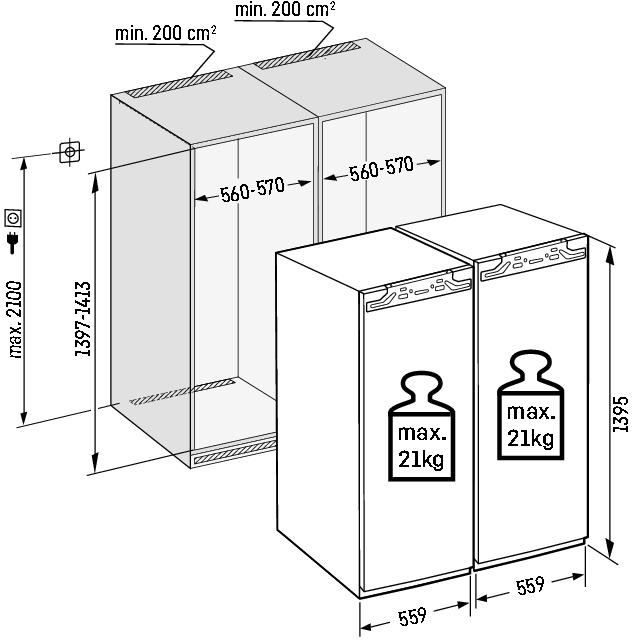 Размер ниши для встраивания: от 560 до 570 х 550 х от 1397 до 1413 мм (х2)